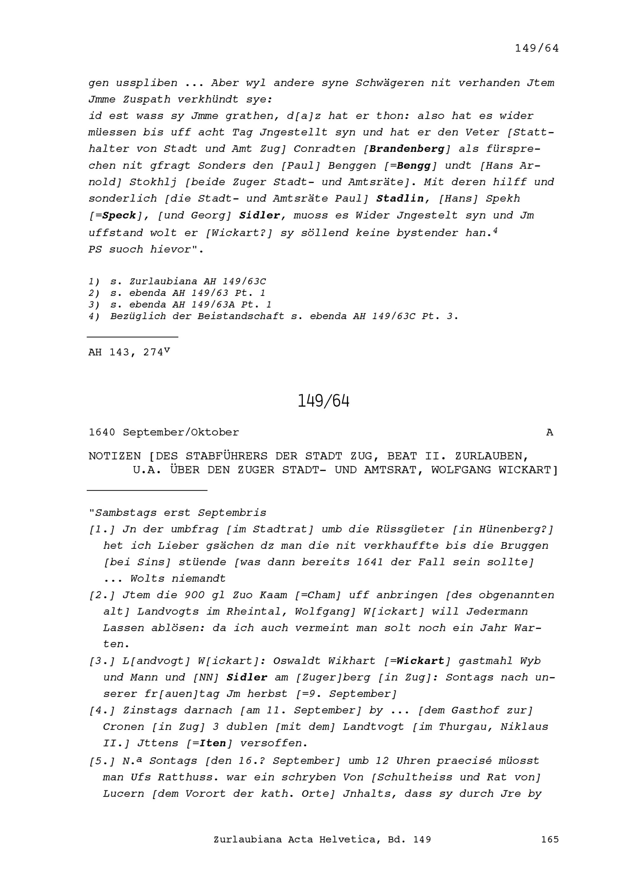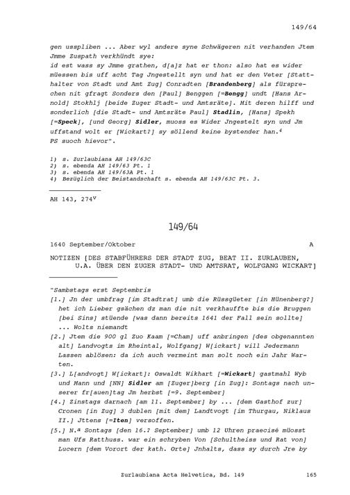 Notiz von Beat II. Zurlauben, Stabführer der Stadt Zug, unter anderem über Wolfgang Wickart, Stadt- und Amtrat Zug