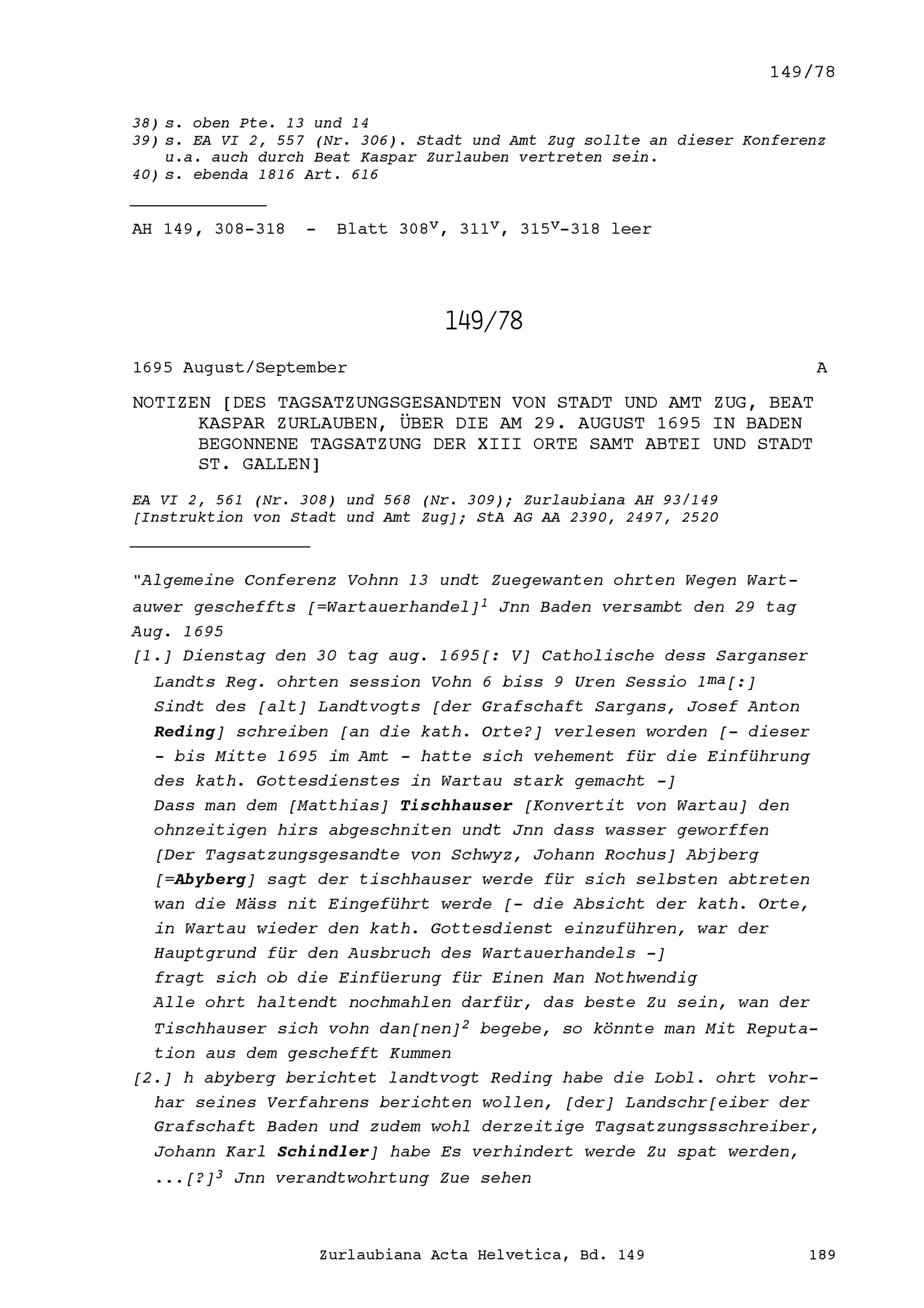 Notiz von Beat Kaspar Zurlauben, Tagsatzungsgesandter, über die Tagsatzung der Dreizehn Orte samt Abtei und Stadt Sankt Gallen, begonnen am 29. August 1695 in Baden