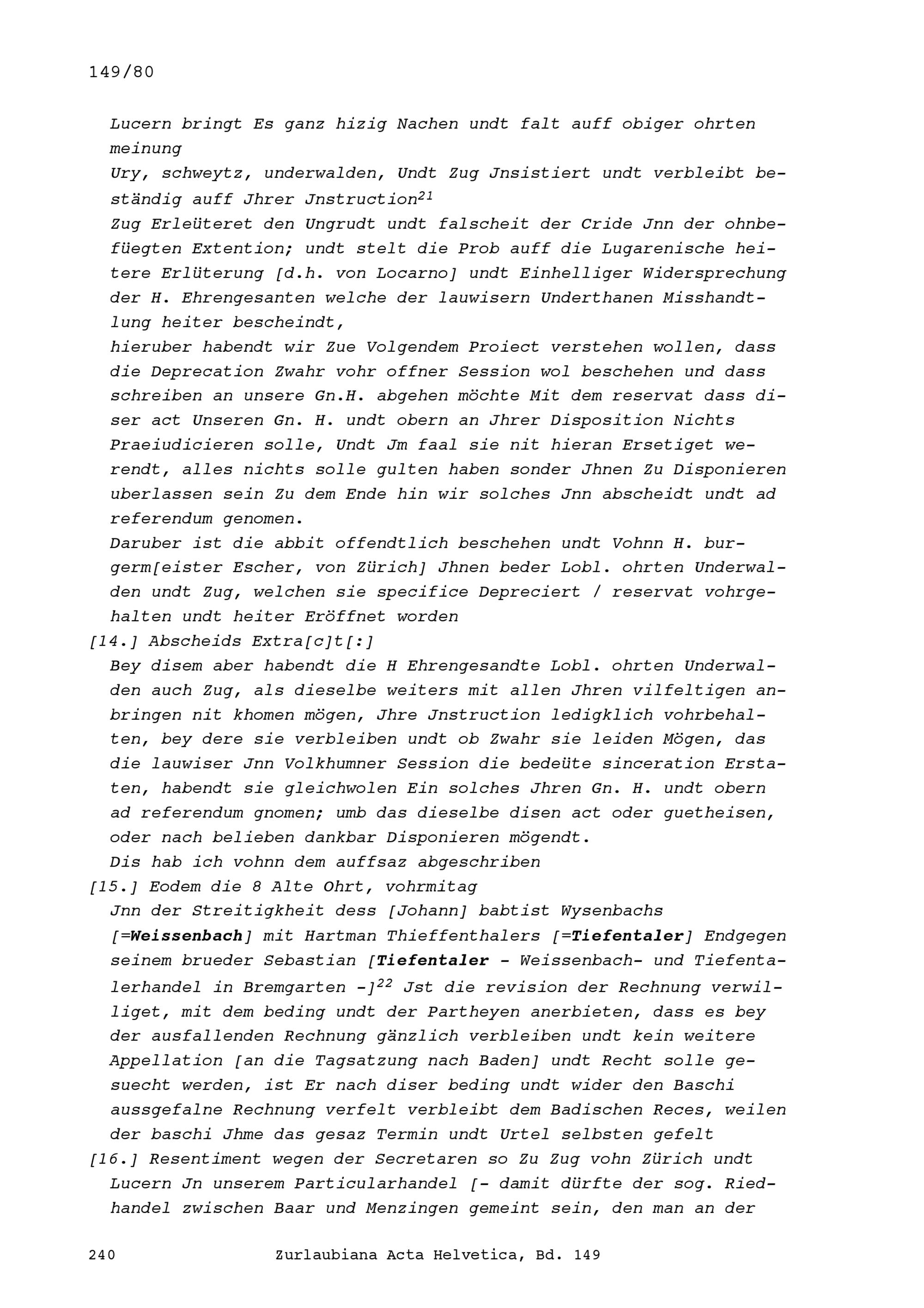 Notiz von Beat Kaspar Zurlauben, Tagsatzungsgesandter von Stadt und Amt Zug, über die Tagsatzung der Zwölf die Ennetbirgischen Vogteien regierenden Orte Dreizehn Orte in Bremgarten, begonnen am 6. April 1693