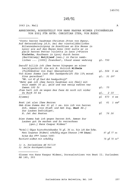 Abrechnung für Christian Iten, Hauptmann, von Ägeri, ausgestellt von Hans Kaspar Widmer, Tuchhändler von Zug