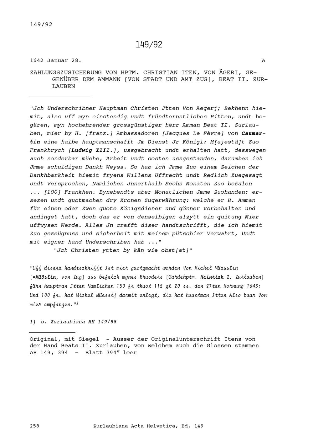 Zahlungszusicherung von Christian Iten, Hauptmann, von Ägeri, gegenüber Beat II. Zurlauben, Ammann von Stadt und Amt Zug