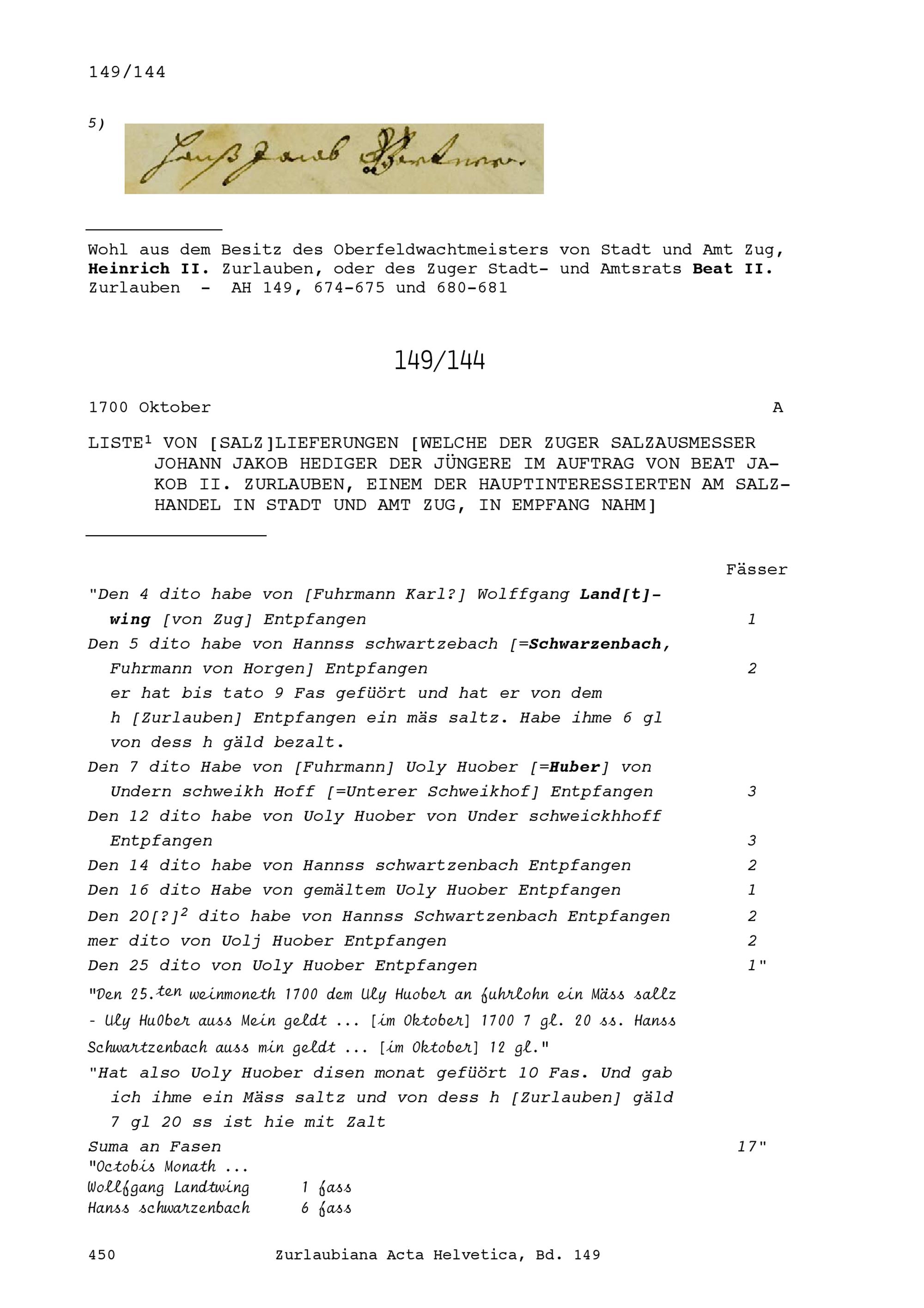 Salzlieferungen, die Johann Jakob Hediger, der jüngere, Zuger Salzausmesser, im Auftrag von Beat Jakob II. Zurlauben in Empfang nahm