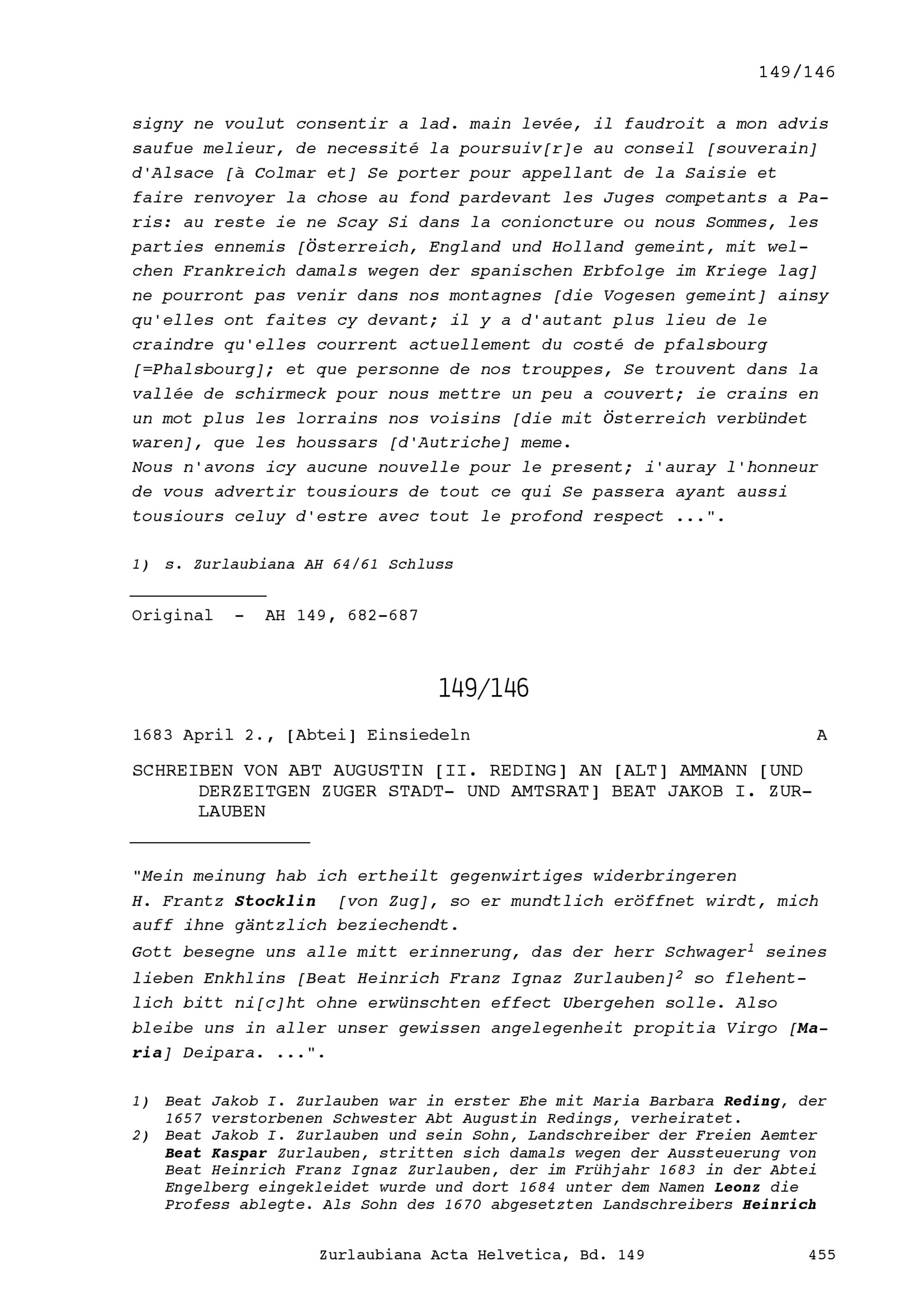 Schreiben von Augustin II. Reding, Abt, an Beat Jakob I. Zurlauben, Altammann und Stadt- und Amtrat Zug