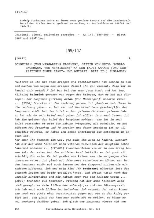 Schreiben von Margaretha Elsener, Gattin von Konrad Bachmann, Hauptmann, von Menzingen...