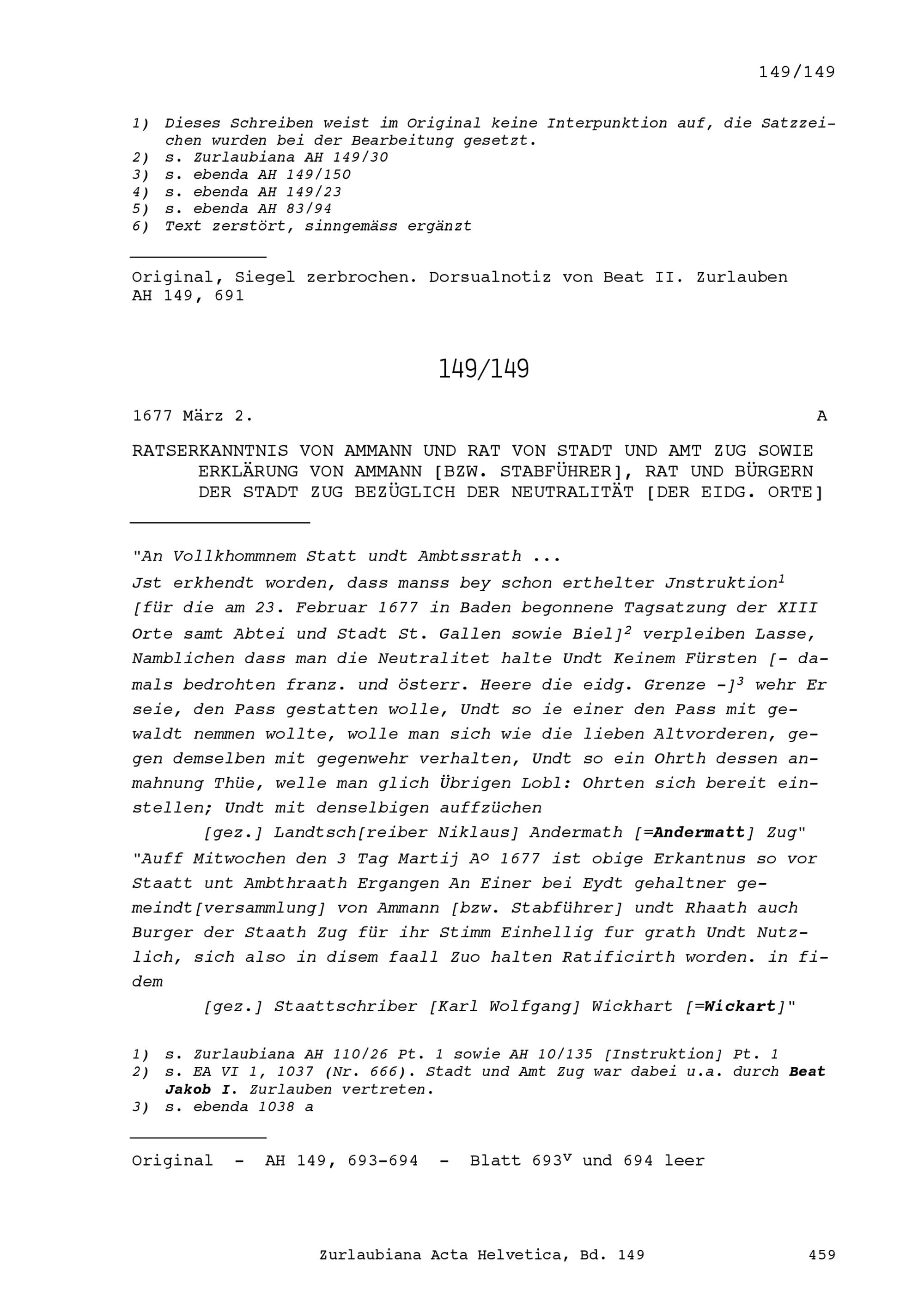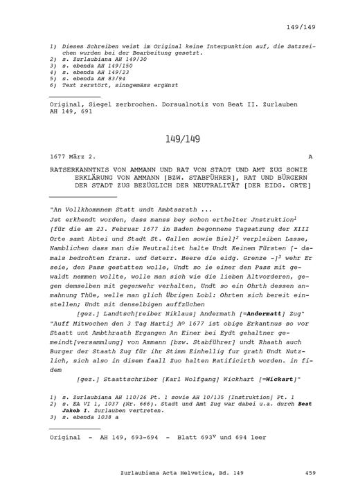 Ratsbeschluss des Ammanns und Rats von Stadt und Amt Zug sowie Erklärung des Ammanns (Stabführers), Rats und der Bürger der Stadt Zug bezüglich der Neutralität der Eidgenössischen Orte