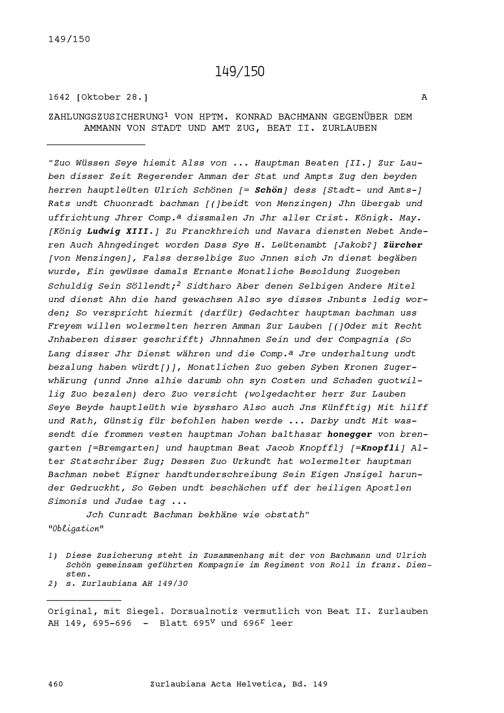 Zahlungszusicherung von Konrad Bachmann, Hauptmann, gegenüber Beat II. Zurlauben, Ammann von Stadt und Amt Zug