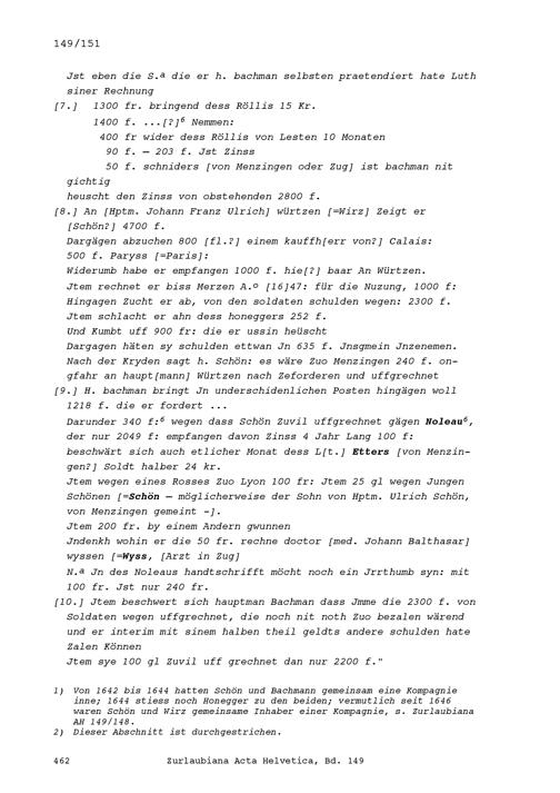 Notiz von Beat II. Zurlauben, Stadt- und Amtrat Zug, betreffend finanzielle Angelegenheiten von Johann Balthasar Honegger, von Bremgarten, von Ulrich Schön, von Konrad Bachmann, beide von Menzingen, und von Johann Franz Ulrich Wirz von Obwalden, alles Hauptleute im Regiment von Roll in französischen Diensten
