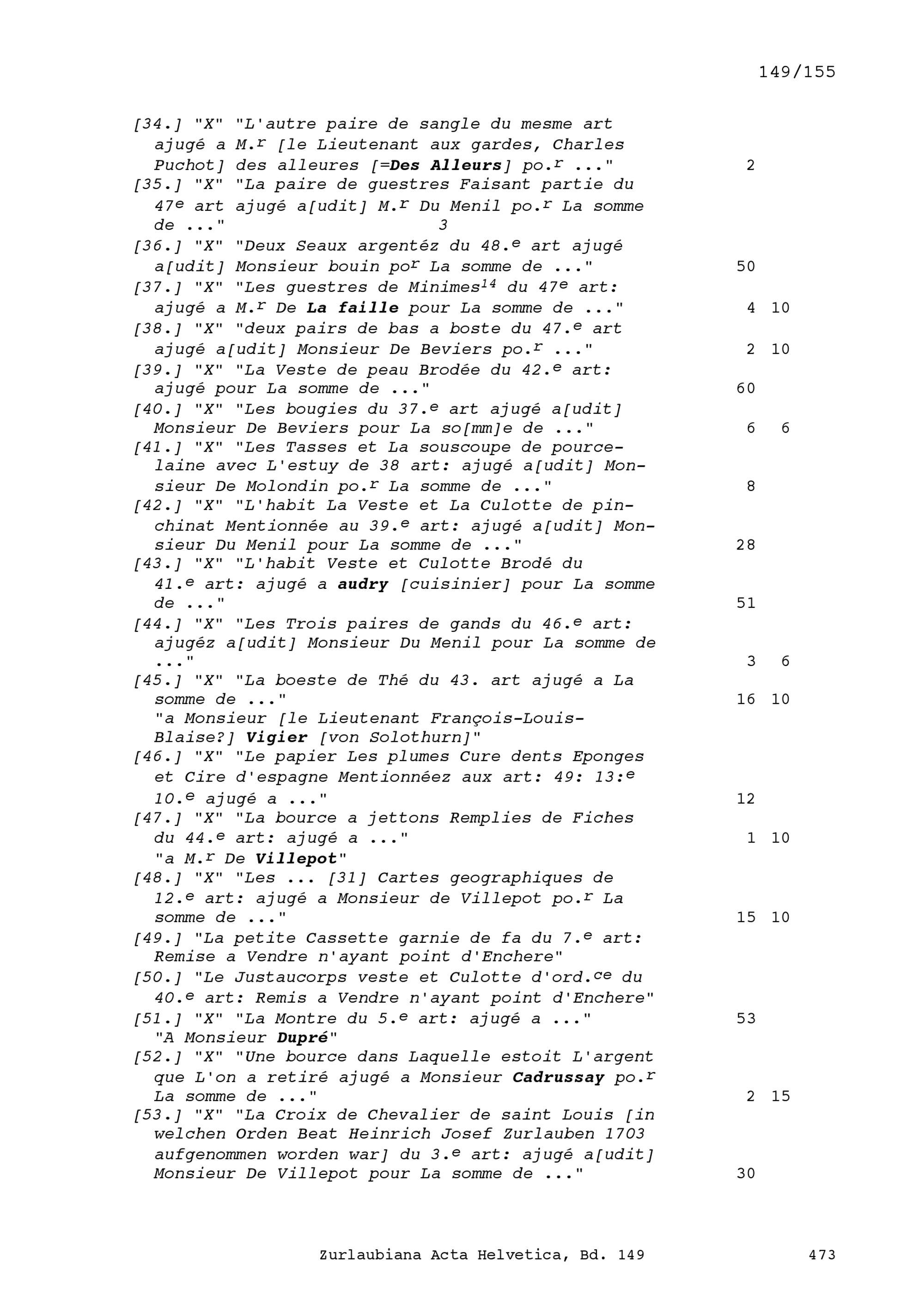 Liste der aus dem Inventar der Hinterlassenschaft von Beat Heinrich Josef Zurlauben, Gardehauptmann und Brigadier, vom 14. Juni 1706 zum Verkauf gelangten Besitztümer