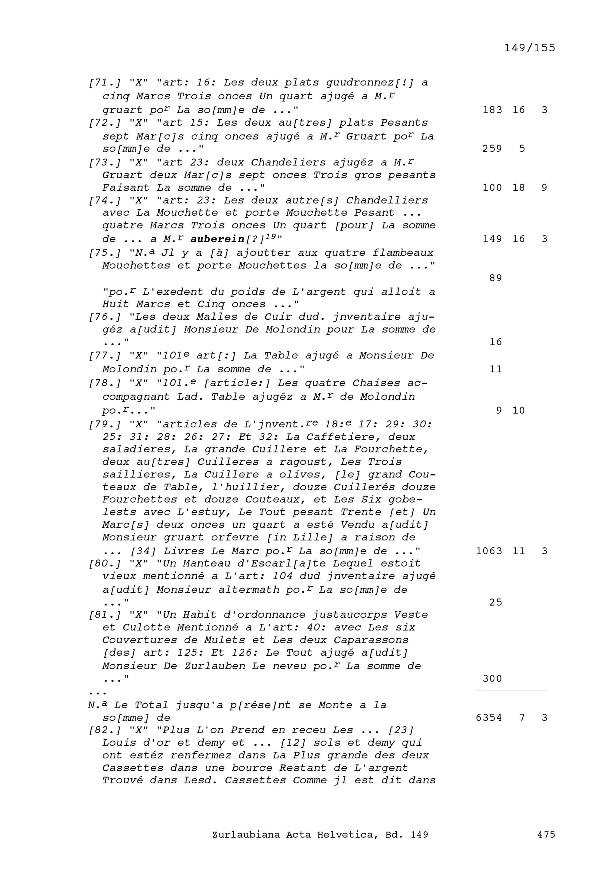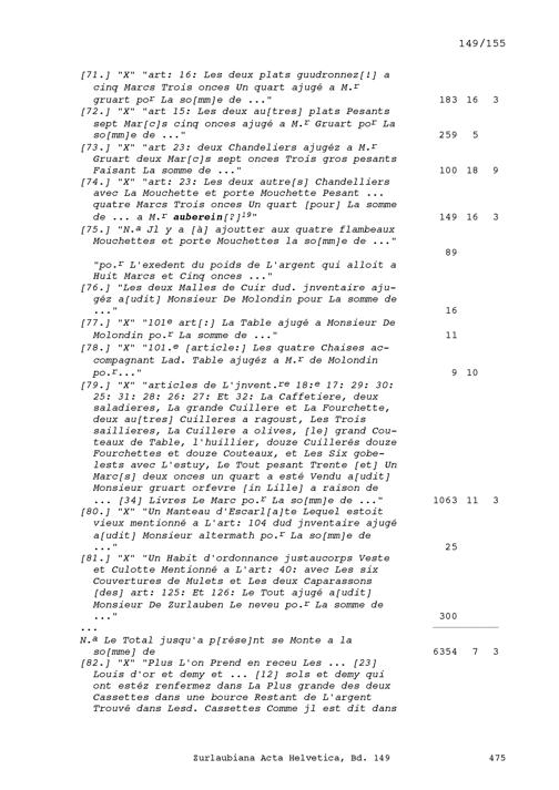 Liste der aus dem Inventar der Hinterlassenschaft von Beat Heinrich Josef Zurlauben, Gardehauptmann und Brigadier, vom 14. Juni 1706 zum Verkauf gelangten Besitztümer