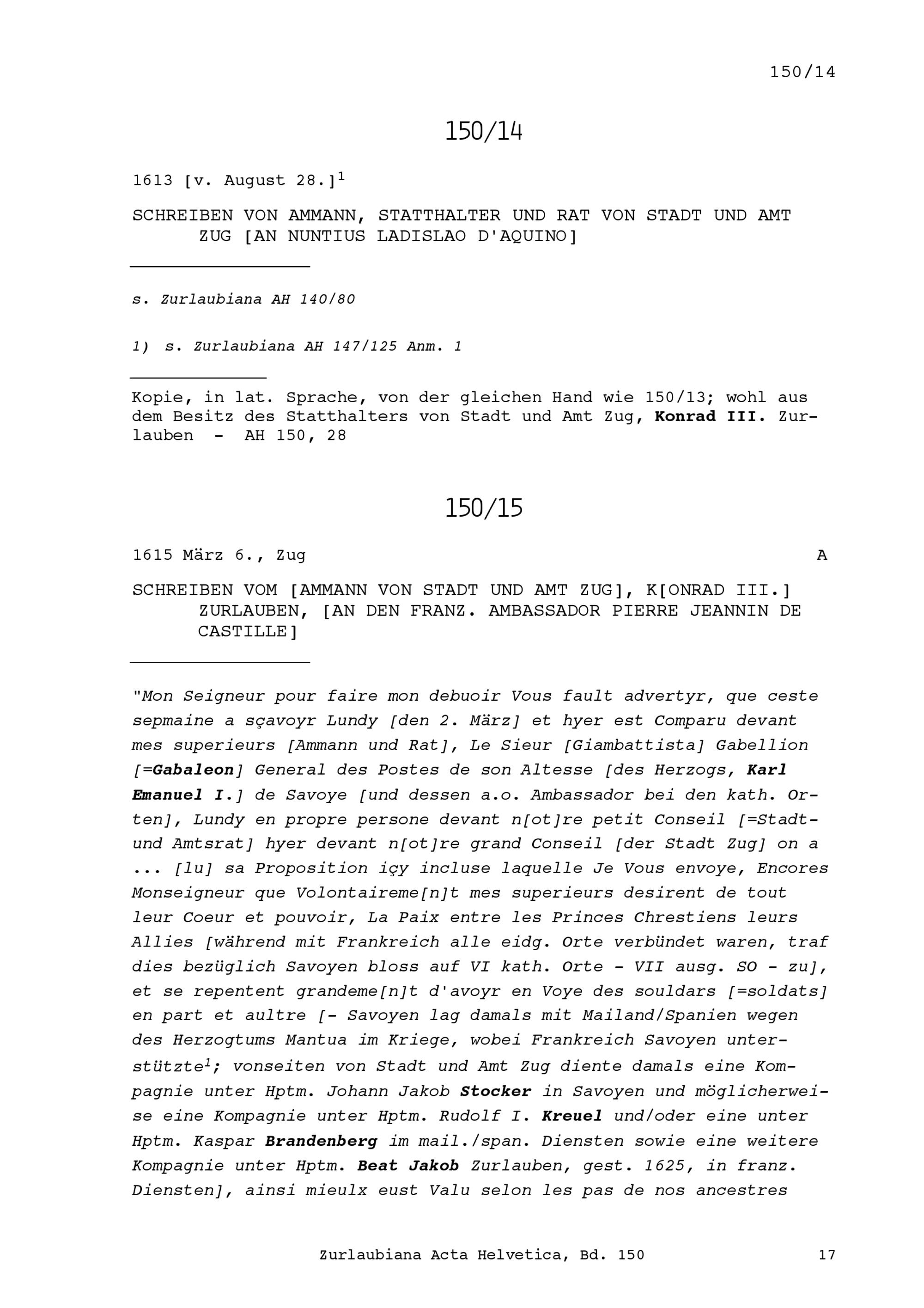 Schreiben des Ammanns, Statthalters und Rats von Stadt und Amt Zug an Ladislao d'Aquino, Nuntius