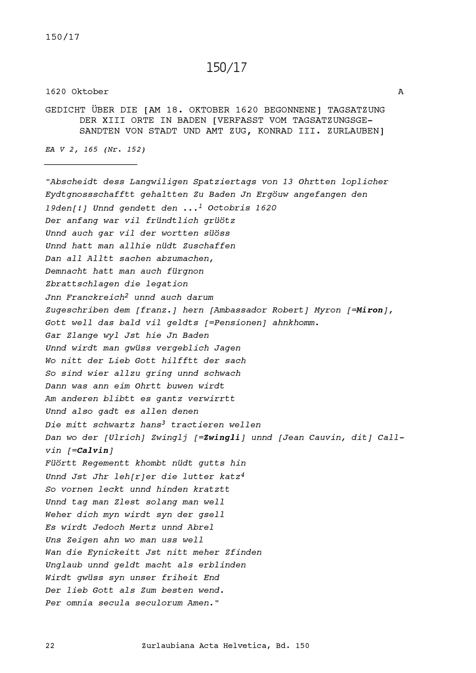 Gedicht über die Tagsatzung der Dreizehn Orte in Baden, begonnen am 18. Oktober 1620,...