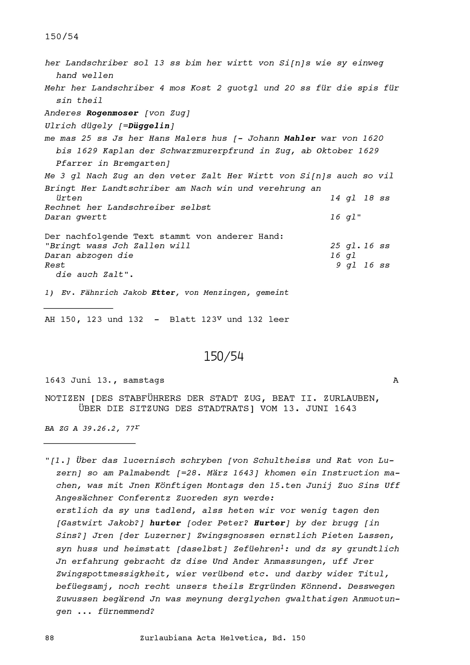 Notiz von Beat II. Zurlauben, Stabführer der Stadt Zug, über die Sitzung des Stadtrats vom 13. Juni 1643