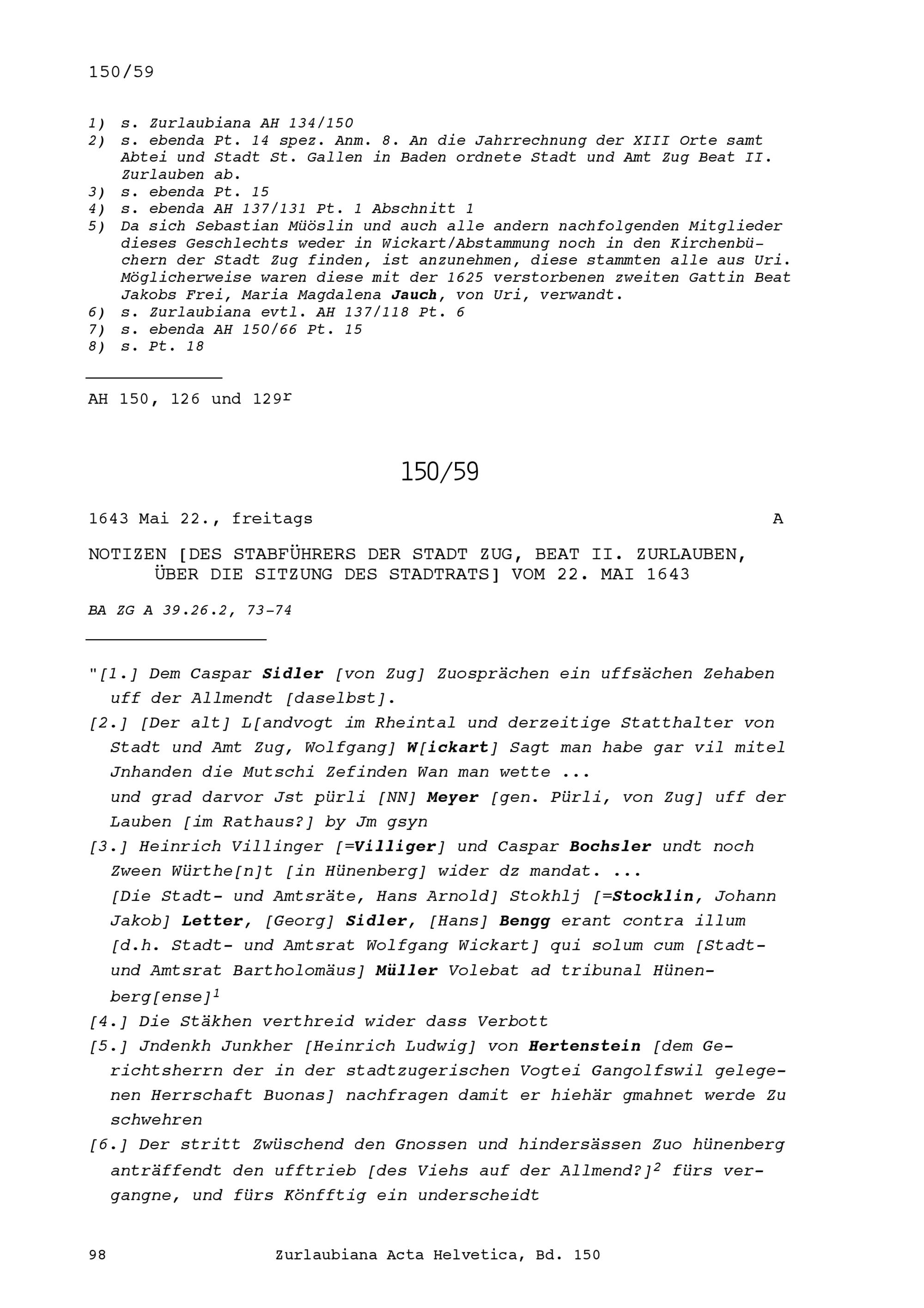 Notiz von Beat II. Zurlauben, Stabführer der Stadt Zug, über die Sitzung des Stadtrats vom 22. Mai 1643