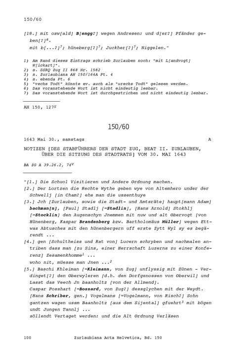 Notiz von Beat II. Zurlauben, Stabführer der Stadt Zug, über die Sitzung des Stadtrats vom 30. Mai 1643