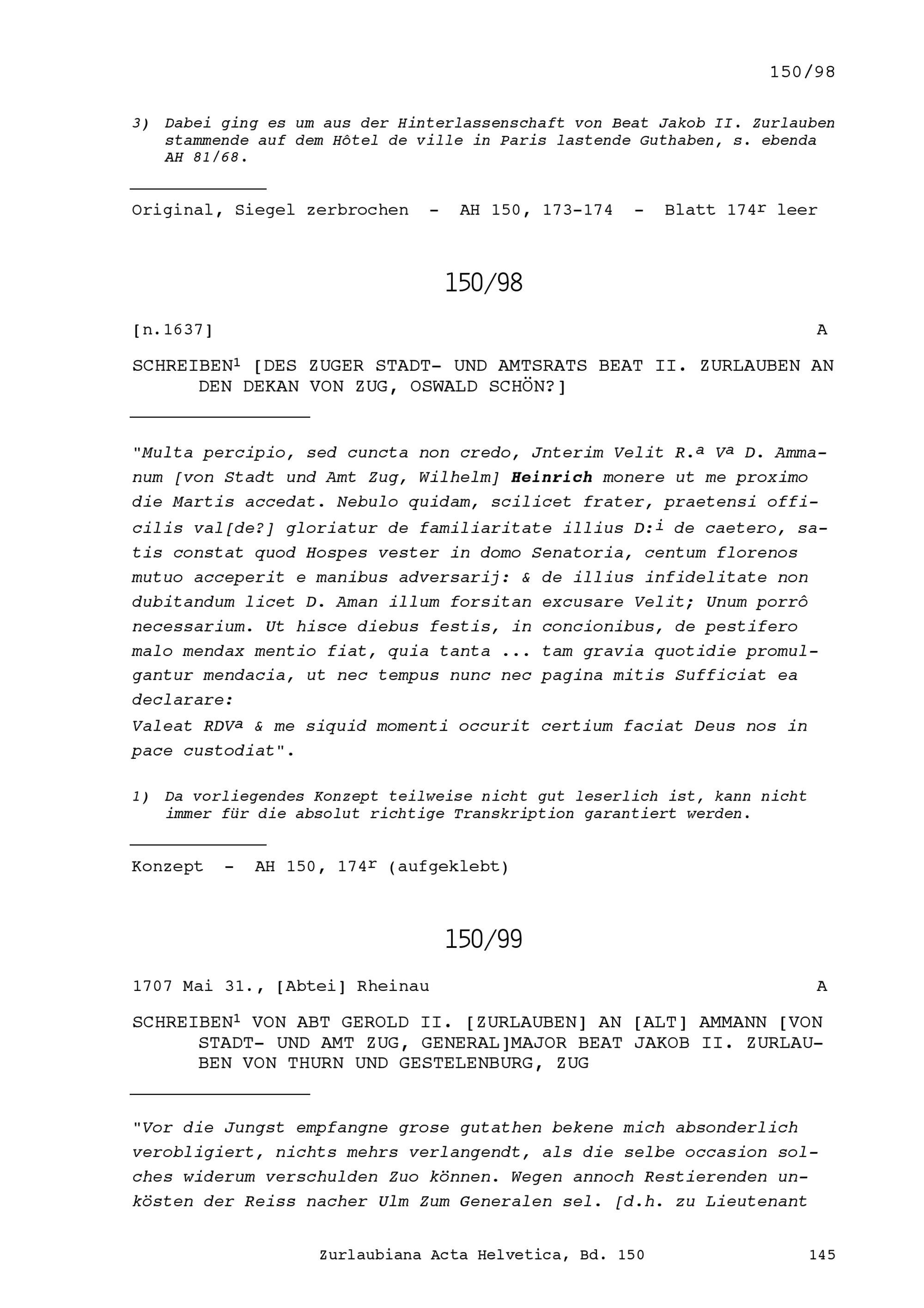 Schreiben von Beat II. Zurlauben, Stadt- und Amtrat Zug, an Oswald Schön, Dekan von Zug