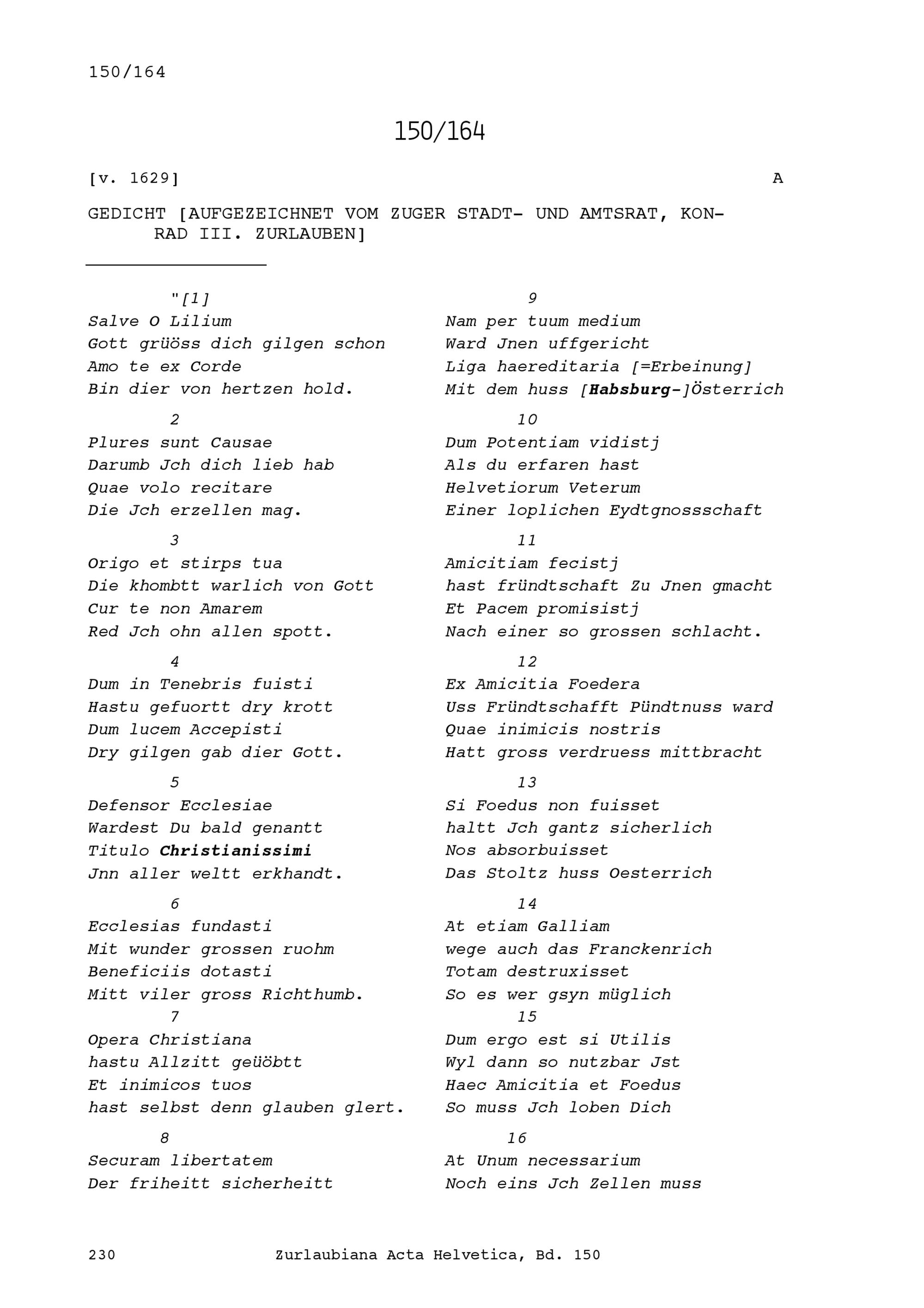 Gedicht auf die Eidgenossenschaft in lateinischer und deutscher Sprache gemischt, aufgezeichnet von Konrad III. Zurlauben, Stadt- und Amtrat Zug
