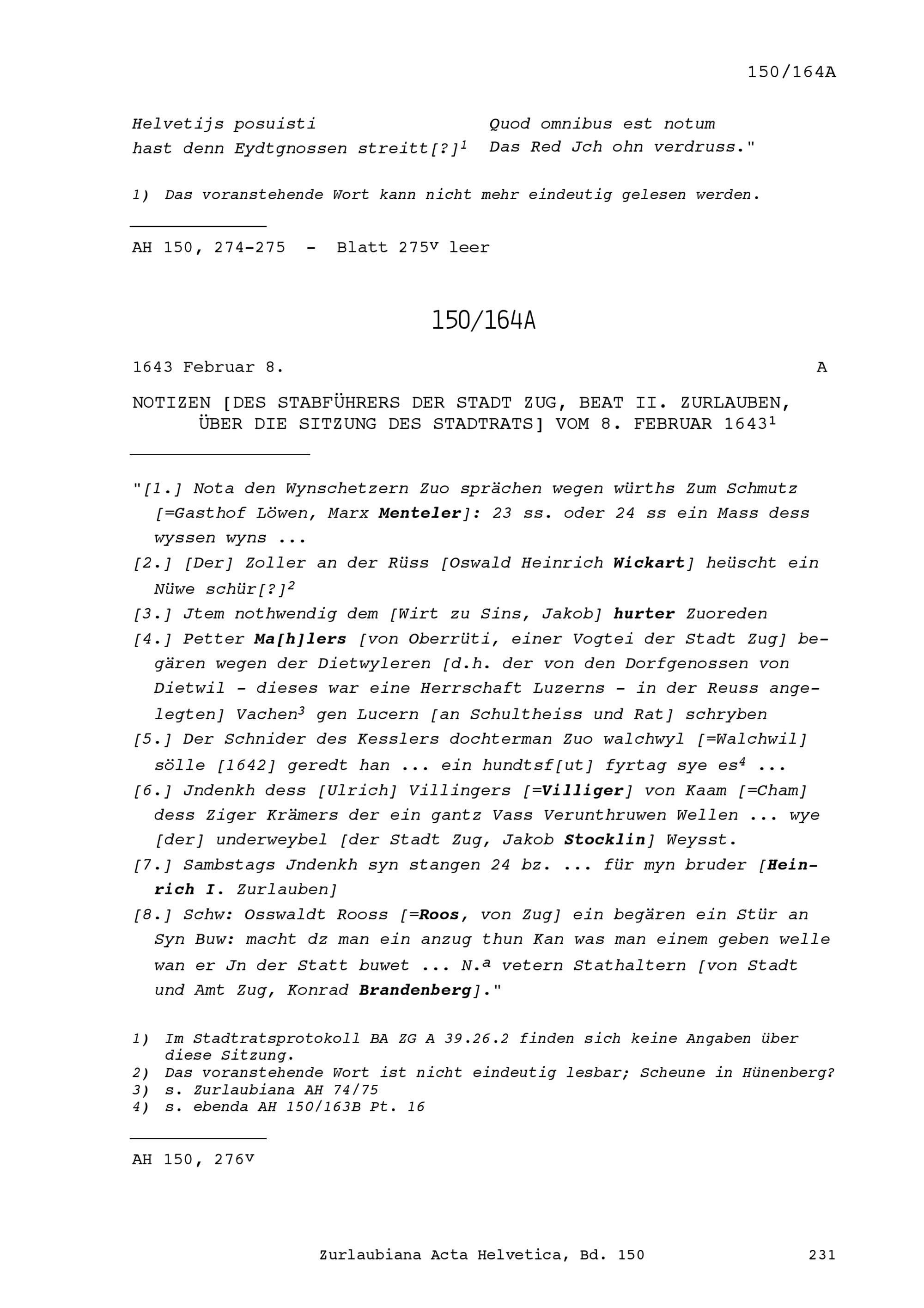 Notiz von Beat II. Zurlauben, Stabführer der Stadt Zug, über die Sitzung des Stadtrats vom 8. Februar 1643