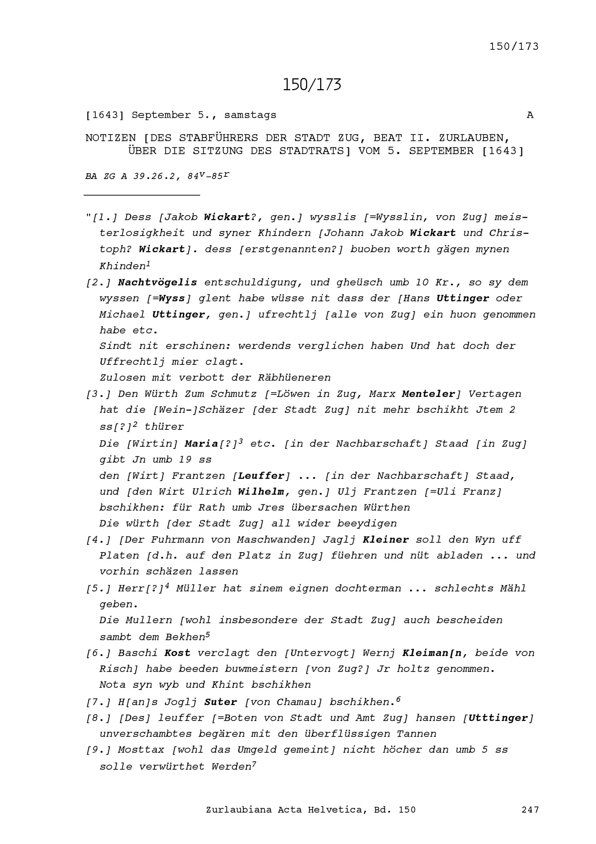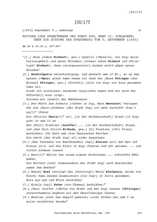 Notiz von Beat II. Zurlauben, Stabführer der Stadt Zug, über die Sitzung des Stadtrats vom 5. September 1643