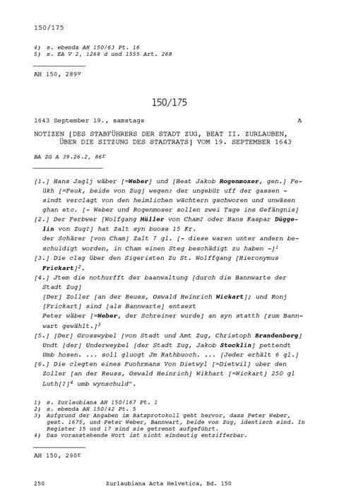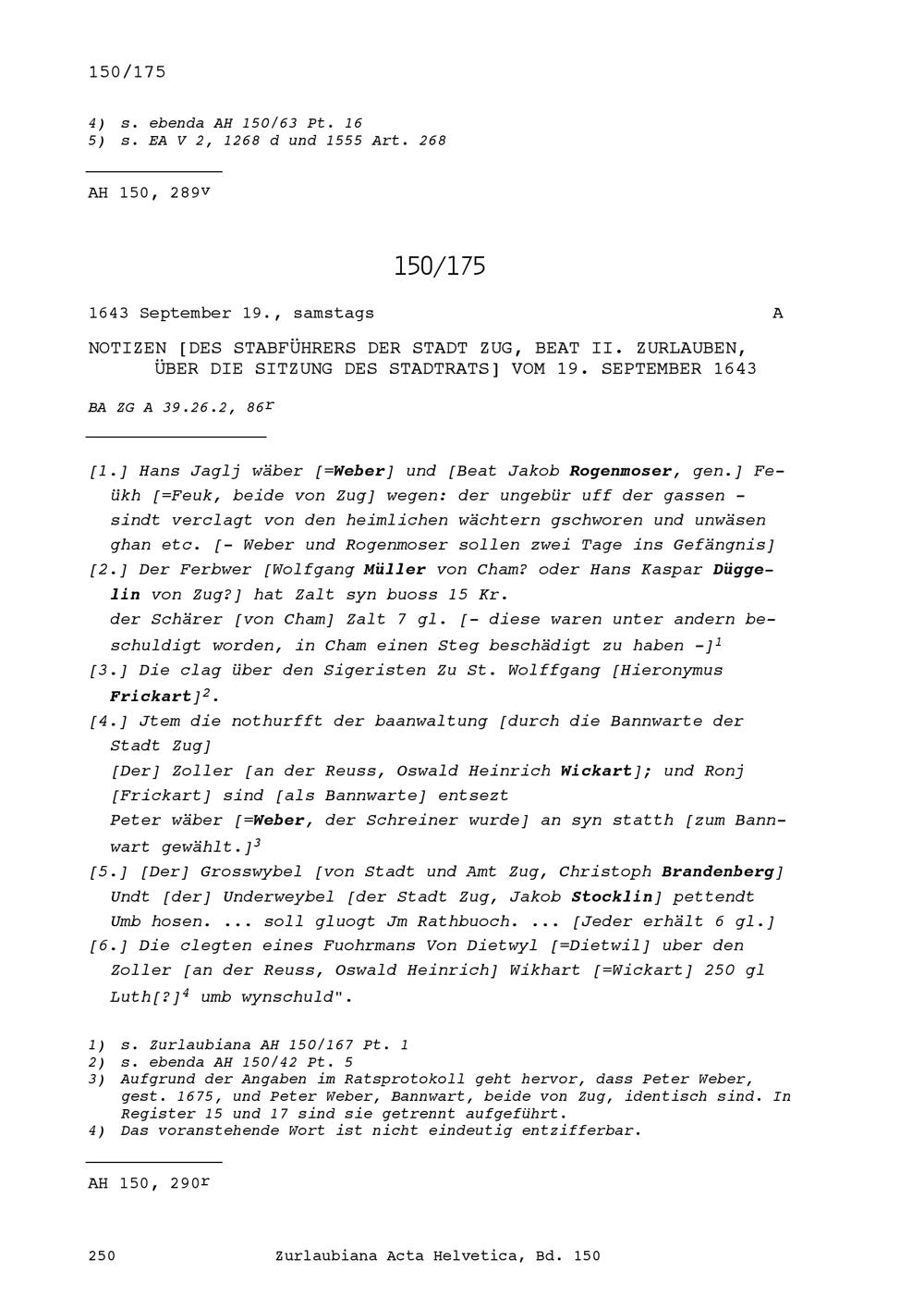 Notiz von Beat II. Zurlauben, Stabführer der Stadt Zug, über die Sitzung des Stadtrats vom 19. September 1643