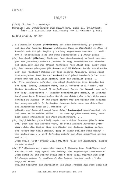 Notiz von Beat II. Zurlauben, Stabführer der Stadt Zug, über die Sitzung des Stadtrats vom 3. Oktober 1643