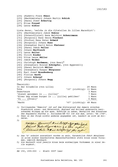 Soldaten der Kompanie von Beat Jakob II. Zurlauben, Hauptmann im Regiment Pfyffer in französischen Diensten, die verletzt, gestorben oder desertiert sind