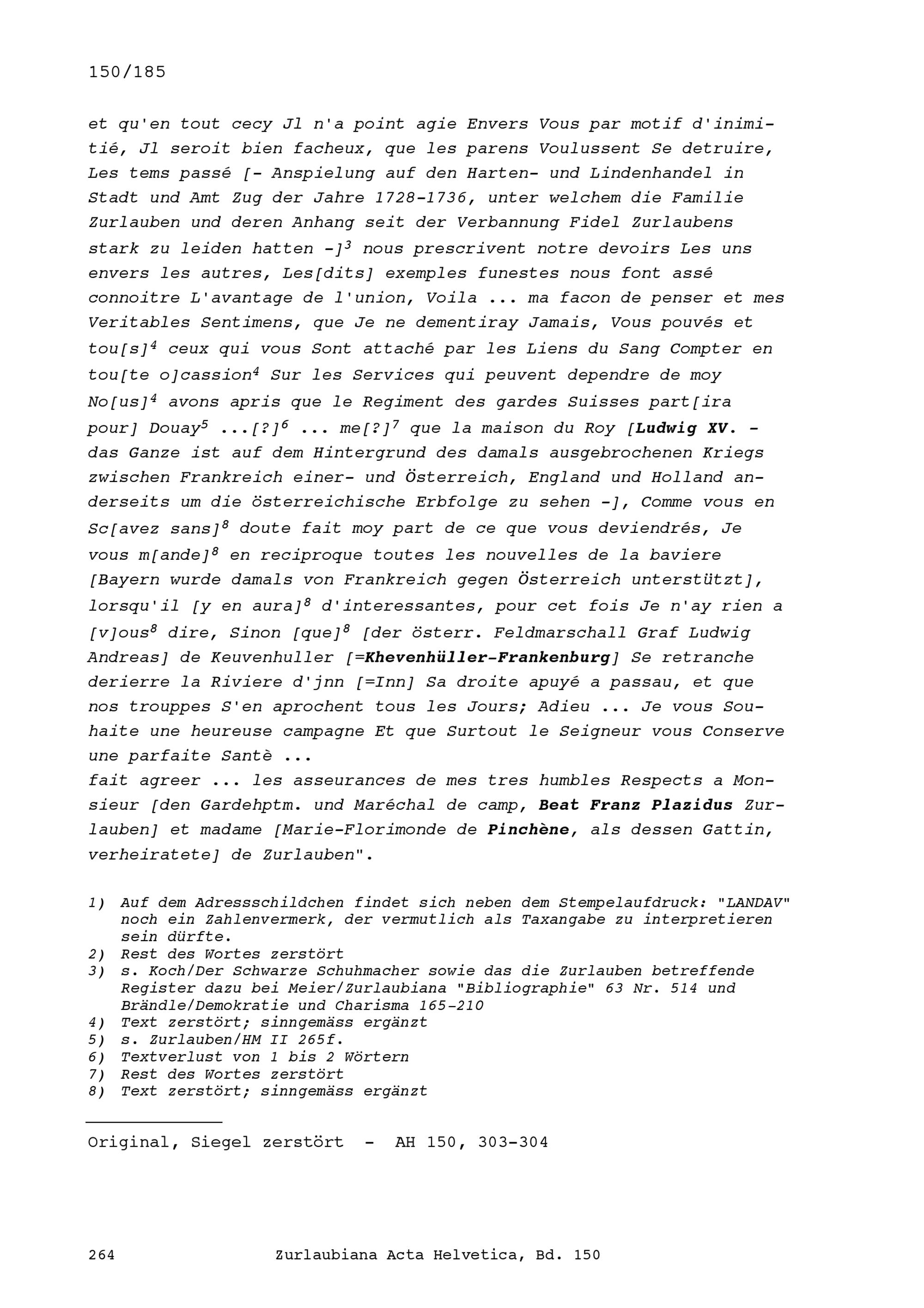 Schreiben von Johann Franz Anton Fidel Landtwing, Hauptmann und Major, an Beat Fidel Zurlauben, Paris