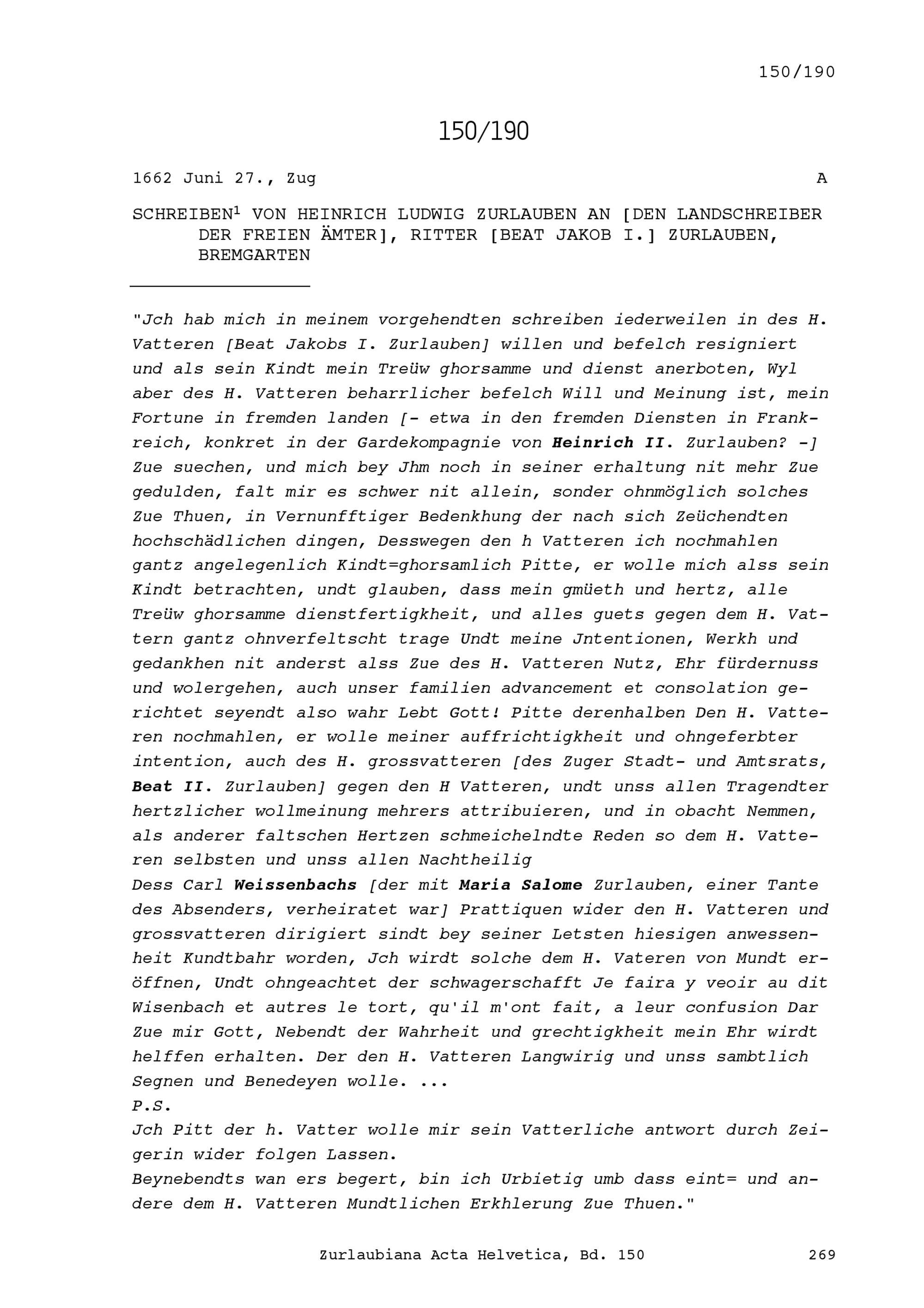 Schreiben von Heinrich Ludwig Zurlauben an Beat Jakob I. Zurlauben, Landschreiber...