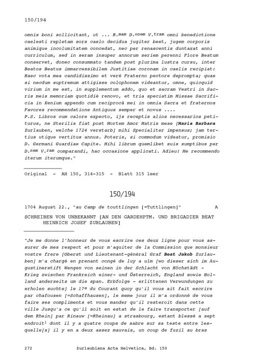 Schreiben von Unbekannt an Beat Heinrich Josef Zurlauben, Gardehauptmann und Brigadier