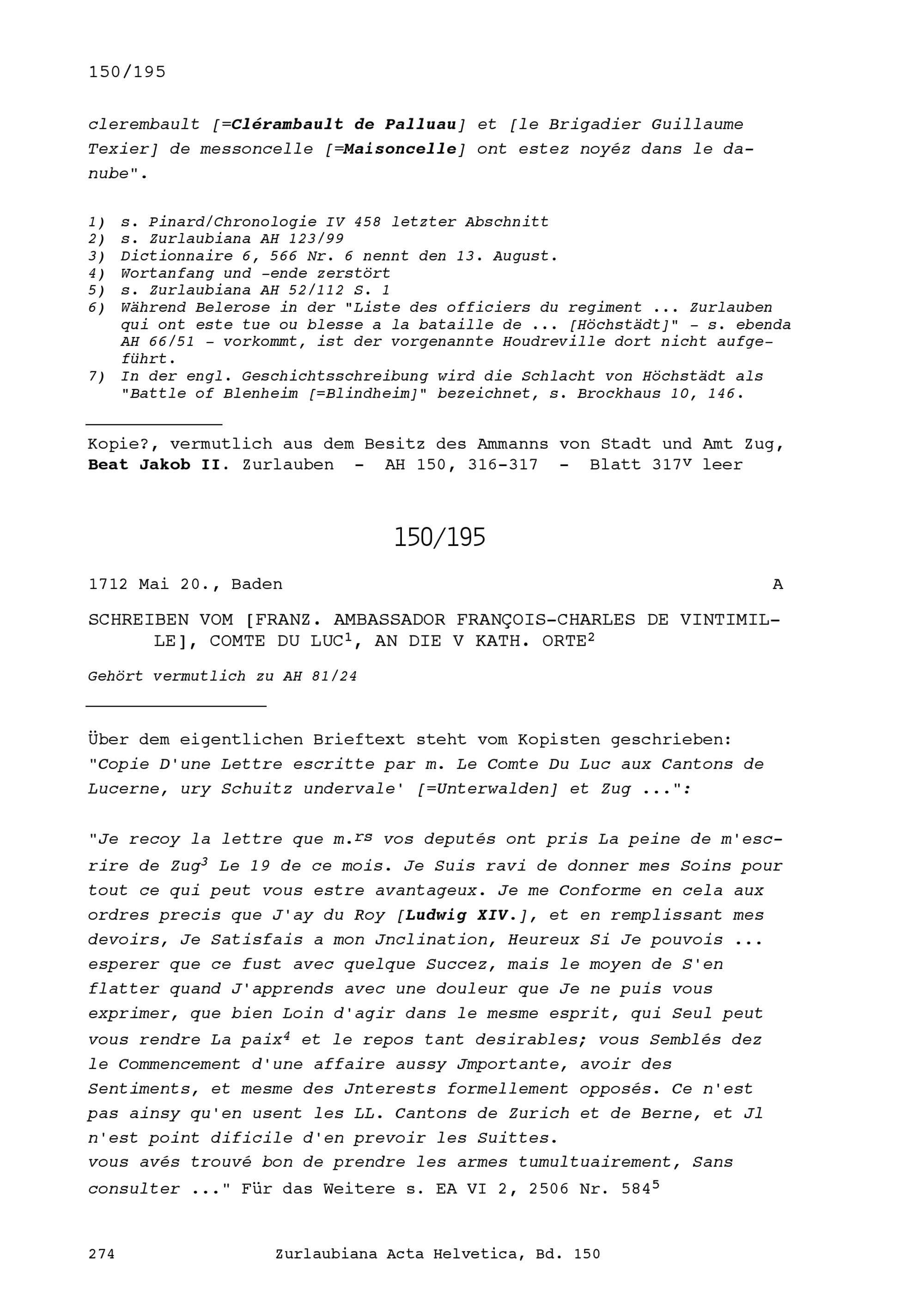 Schreiben von François-Charles de Vintimille, Graf du Luc, Ambassador von Frankreich, an die Fünf Katholischen Orte