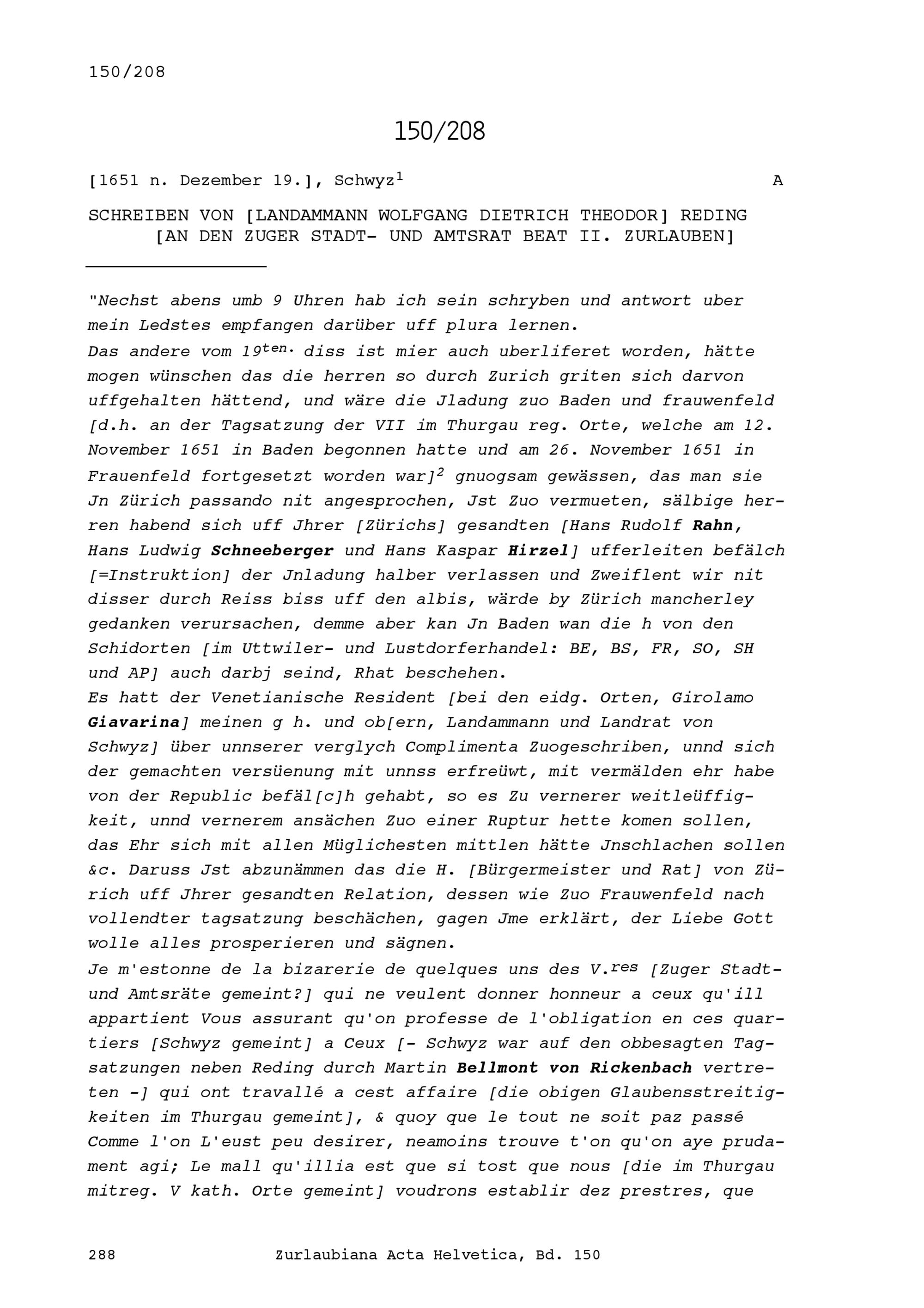 Schreiben von Wolfgang Dietrich Theodor Reding, Landammann, an Beat II. Zurlauben, Stadt- und Amtrat Zug
