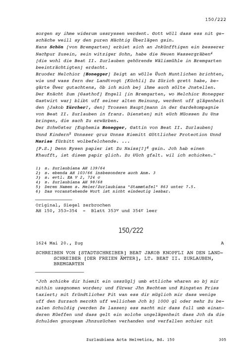 Schreiben von Beat Jakob Knopfli, Stadtschreiber, an Beat II. Zurlauben, Landschreiber...