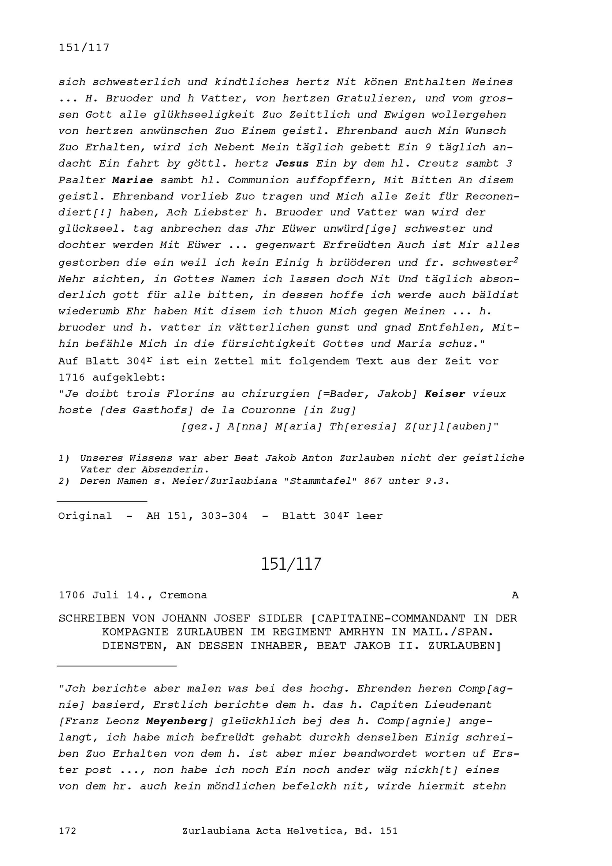 Schreiben von Johann Josef Sidler, Kommandant in der Kompanie Zurlauben im Regiment Amrhyn in mailändisch-spanischen Diensten, an Beat Jakob II. Zurlauben, dessen Inhaber