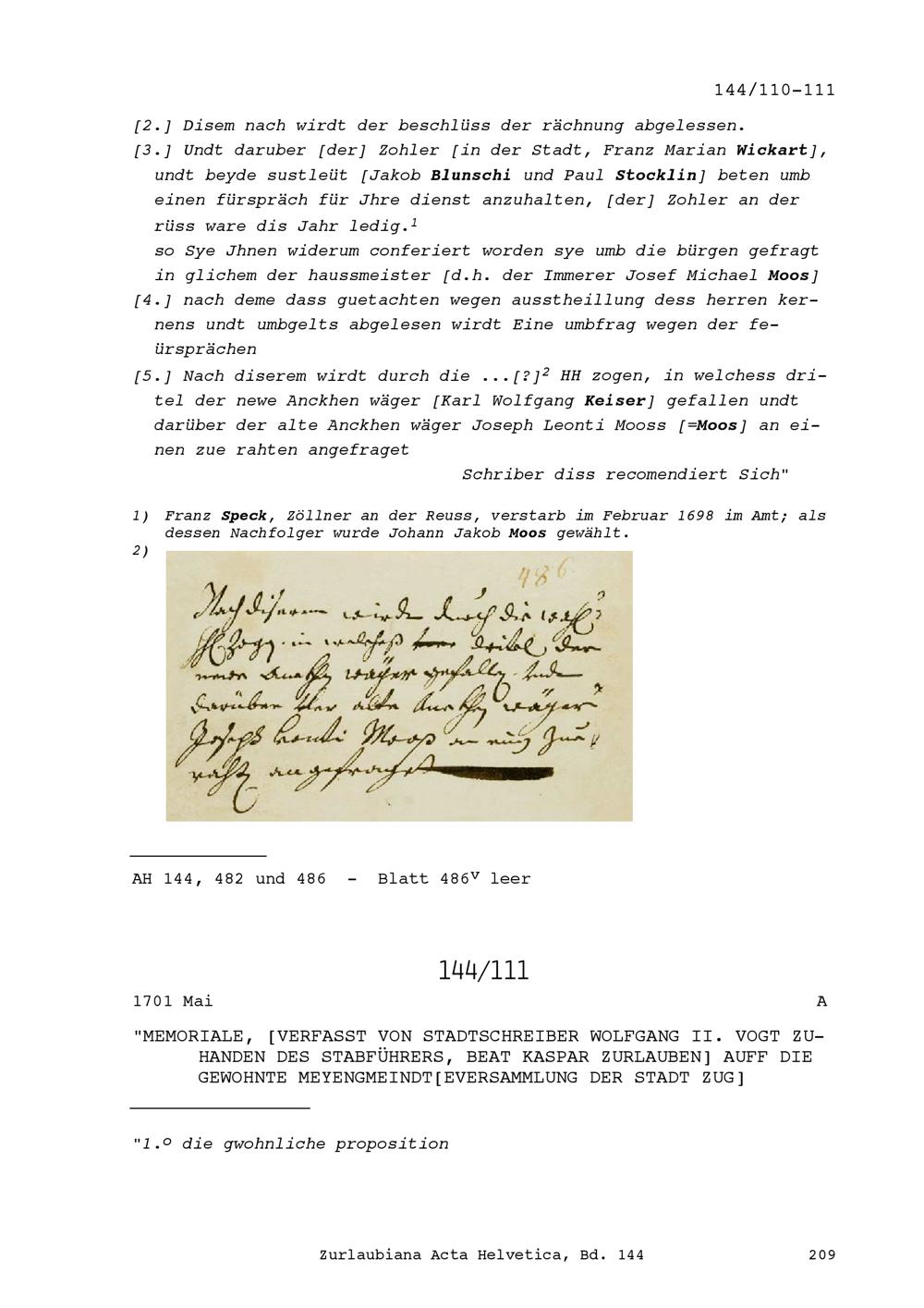 Bericht zuhanden von Beat Kaspar Zurlauben, Stabführer der Stadt Zug, zur Sankt-Johannes-Gemeindeversammlung der Stadt Zug, verfasst von Wolfgang II. Vogt, Stadtschreiber