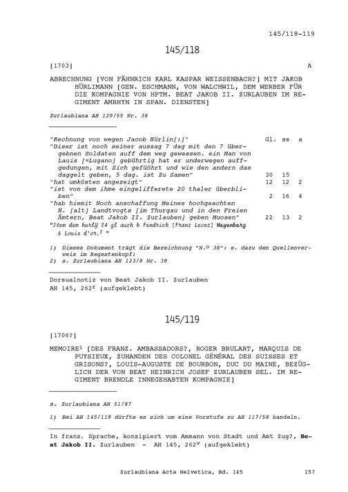 Notiz von Roger Brûlart, Marquis de Puysieux, Ambassador von Frankreich, zuhanden von Louis-Auguste de Bourbon, Duc du Maine, Generaloberst der Schweizer und Bündner, bezüglich der von Beat Heinrich Josef Zurlauben, selig, im Regiment Jost Brendlé innegehabten Kompanie