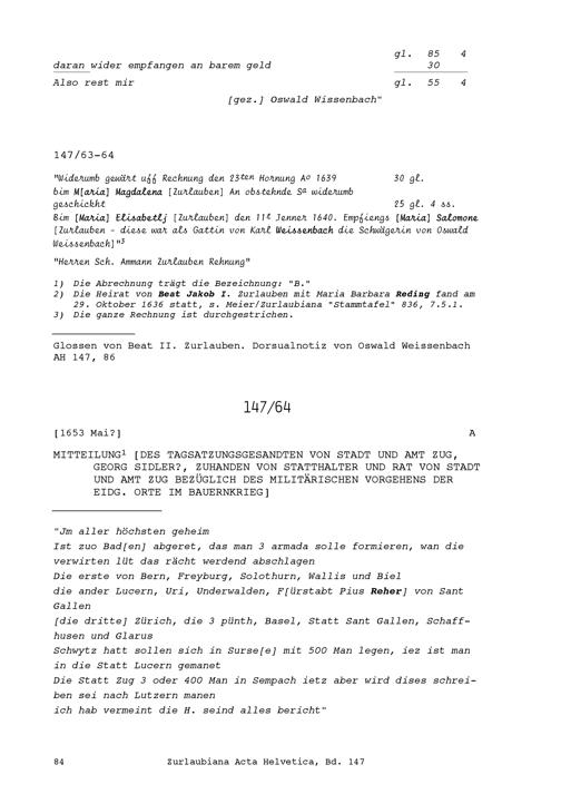 Rechnung für Beat II. Zurlauben, Stabführer der Stadt Zug, ausgestellt von Oswald...
