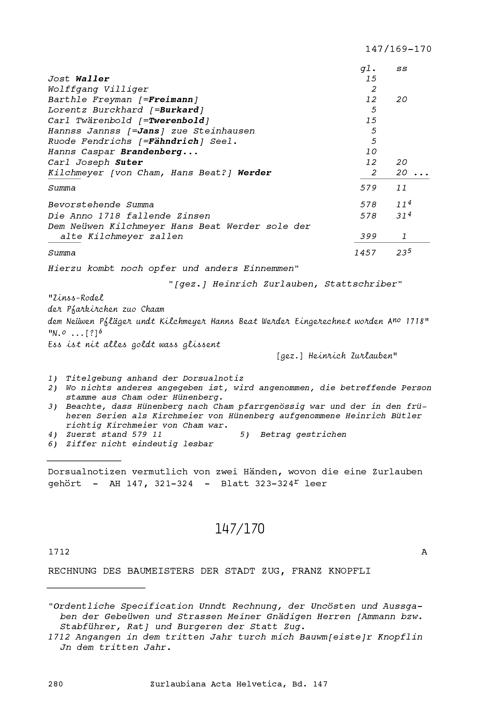 Zinsrodel der Pfarrkirche Cham, aufgezeichnet von Heinrich Damian Leonz Zurlauben, Zuger Stadtschreiber