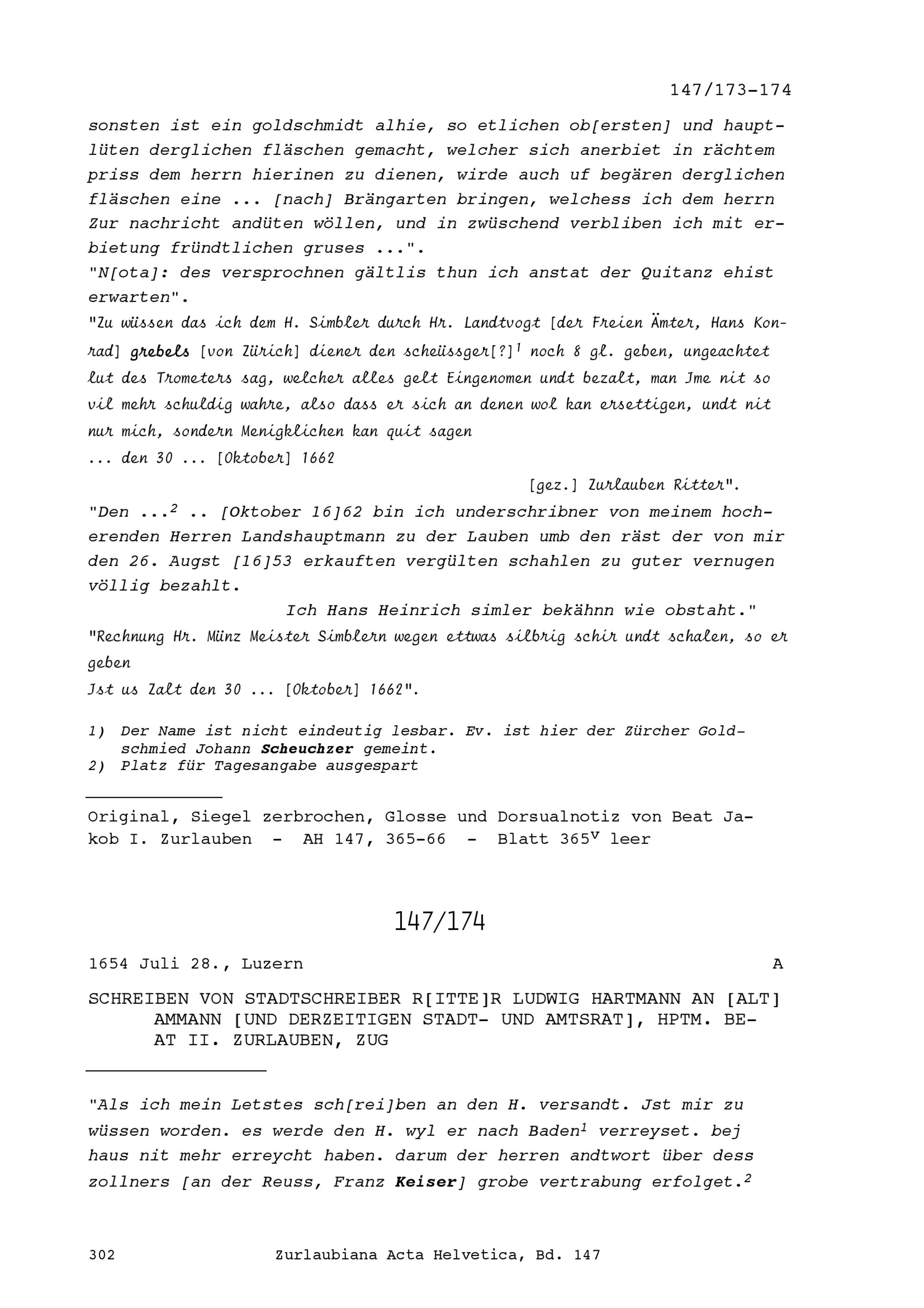 Schreiben von Hans Heinrich Simler, Goldschmied und Münzmeister, an Beat Jakob I. Zurlauben, Landeshauptmann und Landschreiber der Freien Ämter, Bremgarten