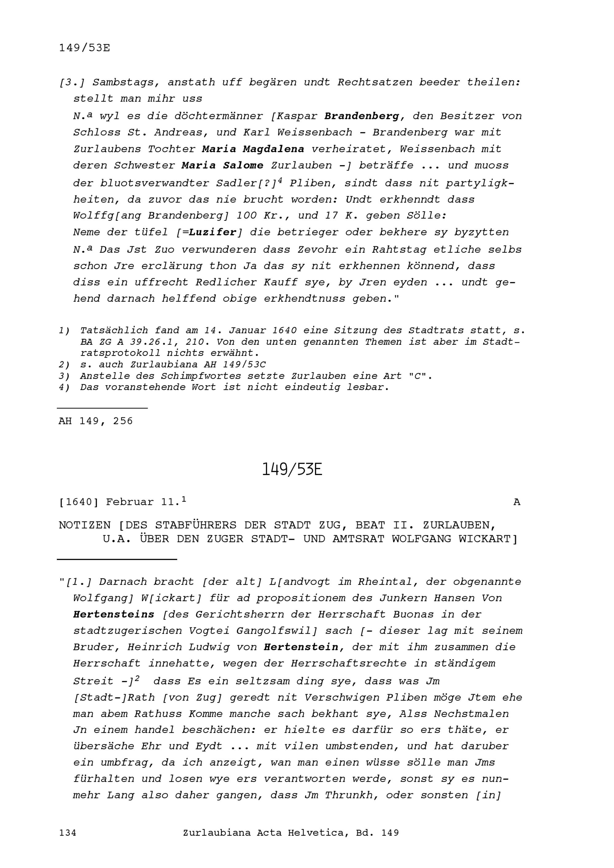 Notiz von Beat II. Zurlauben, Stabführer der Stadt Zug