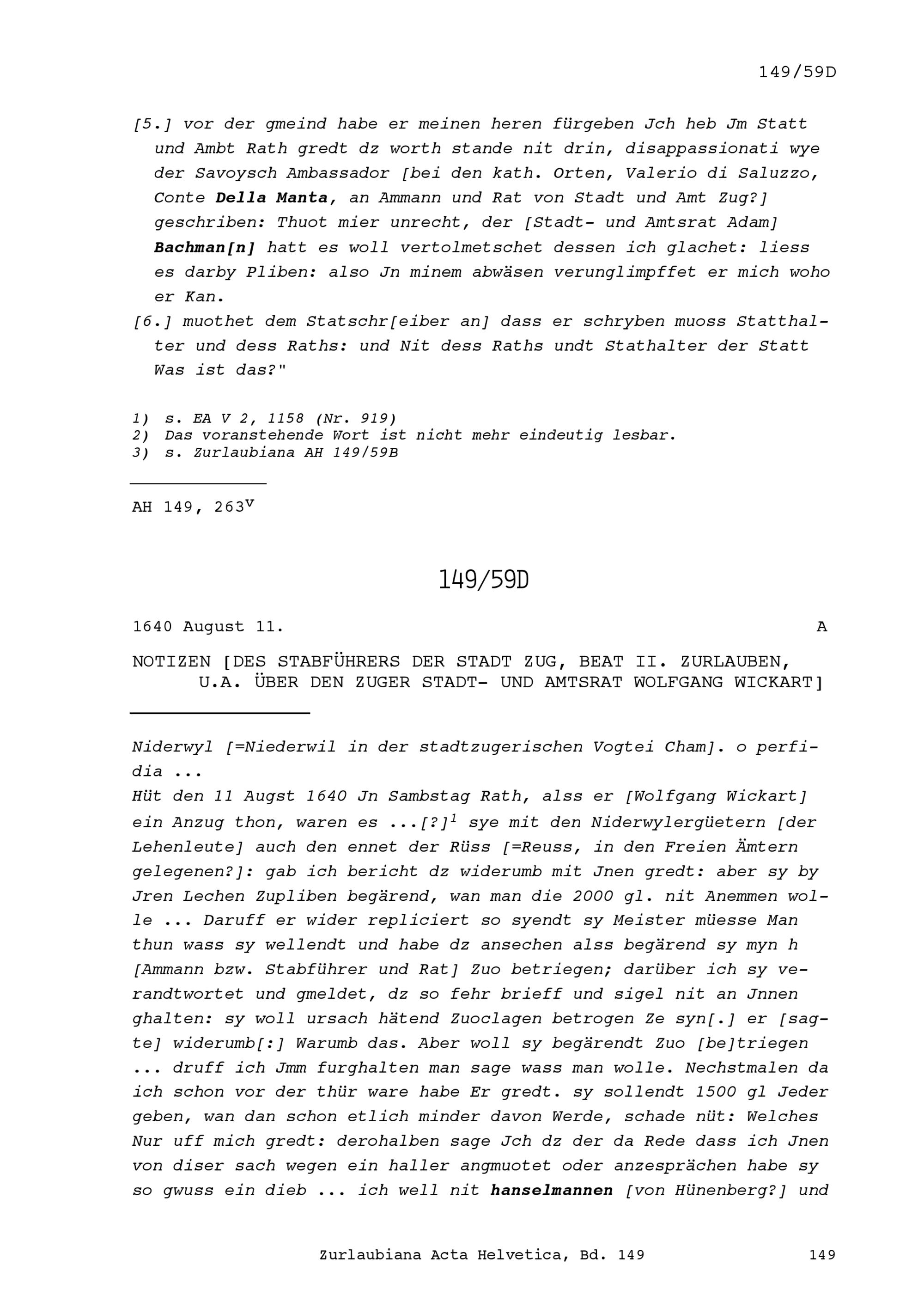 Notiz von Beat II. Zurlauben, Stabführer der Stadt Zug, unter anderem über Wolfgang Wickart, Stadt- und Amtrat Zug