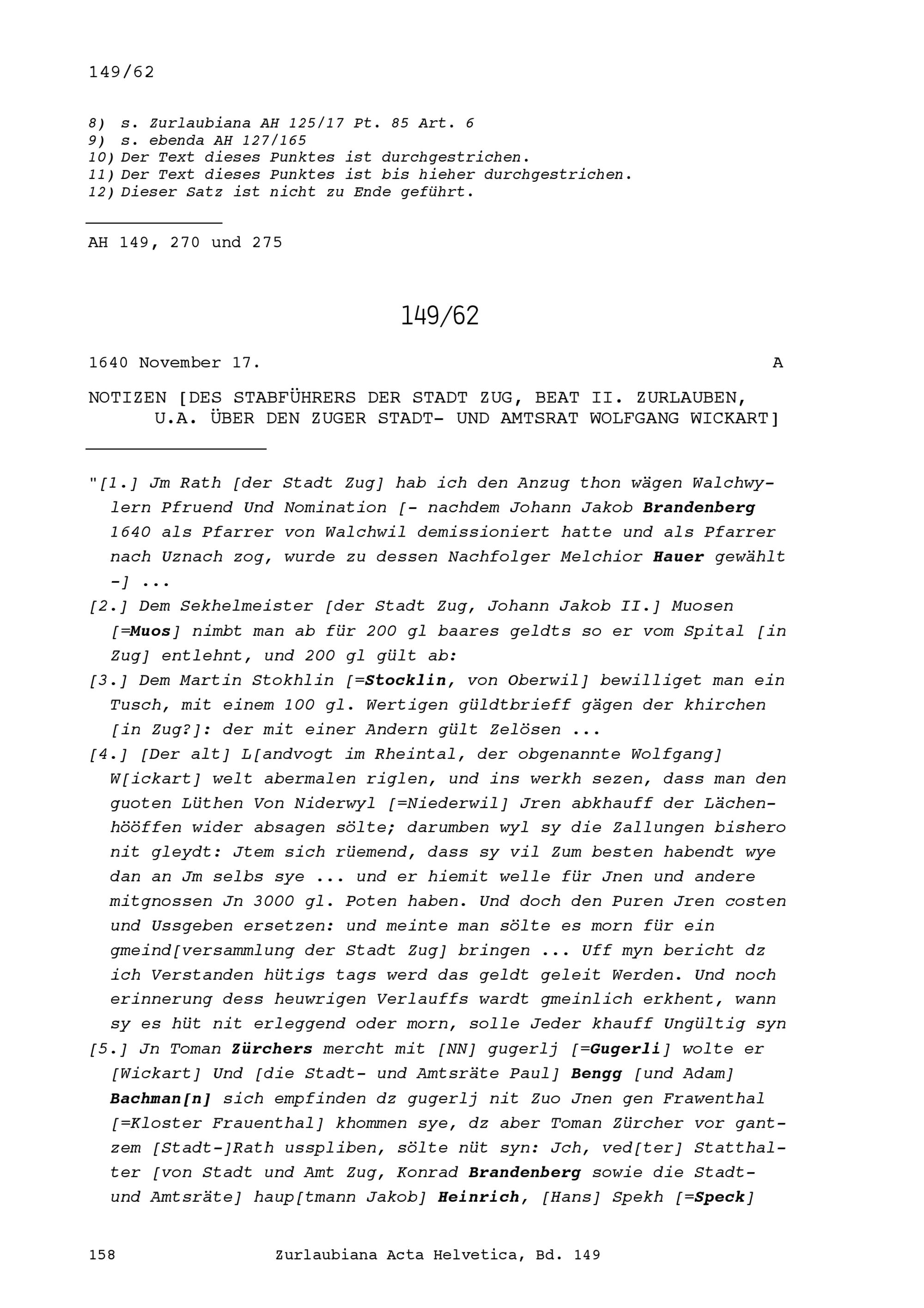 Notiz von Beat II. Zurlauben, Stadt- und Amtrat Zug, in Zusammenhang mit den Friedensverhandlungen nach dem Villmergerkrieg 1656