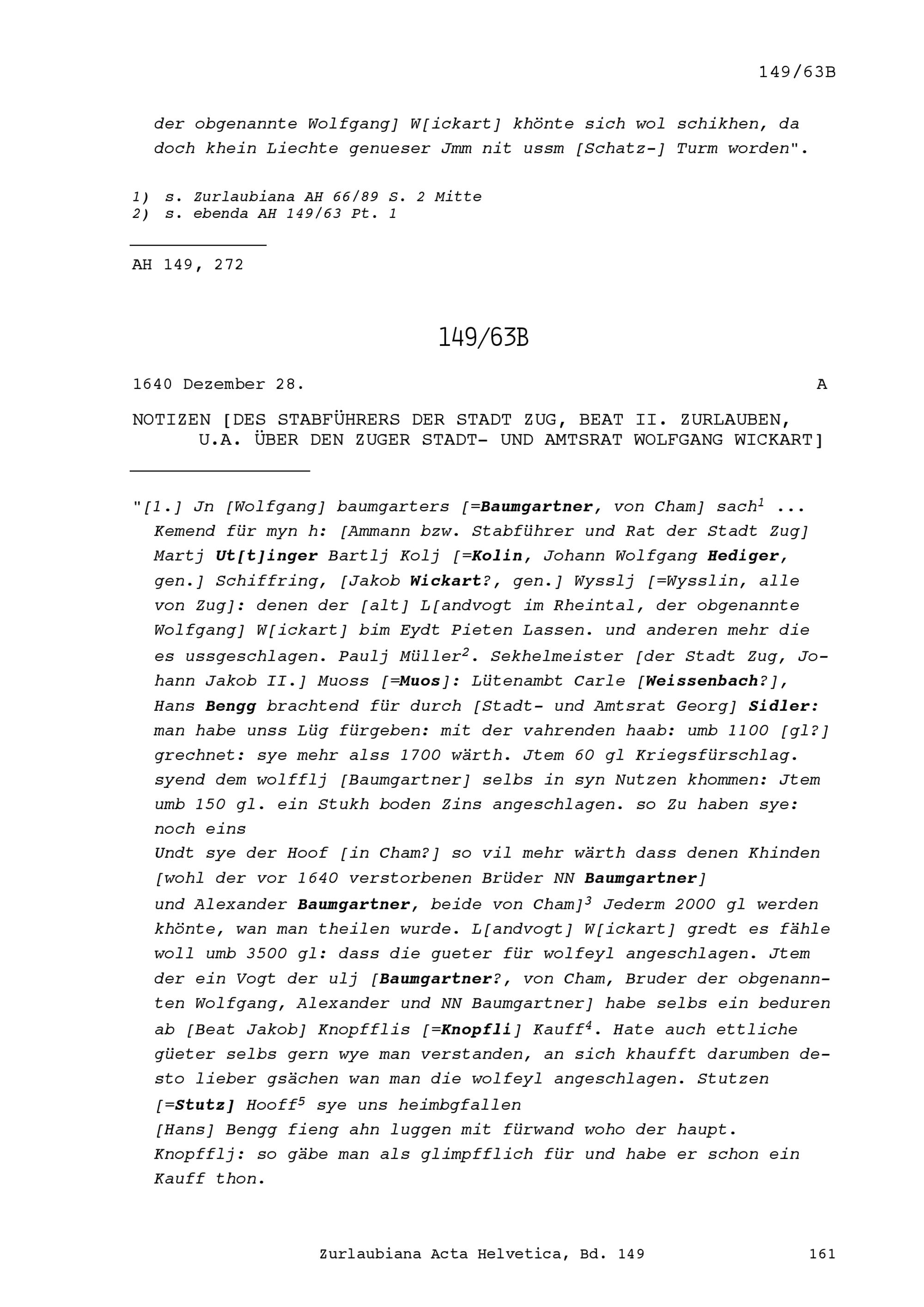 Notiz von Beat II. Zurlauben, Stabführer der Stadt Zug, unter anderem über Wolfgang Wickart, Stadt- und Amtrat Zug