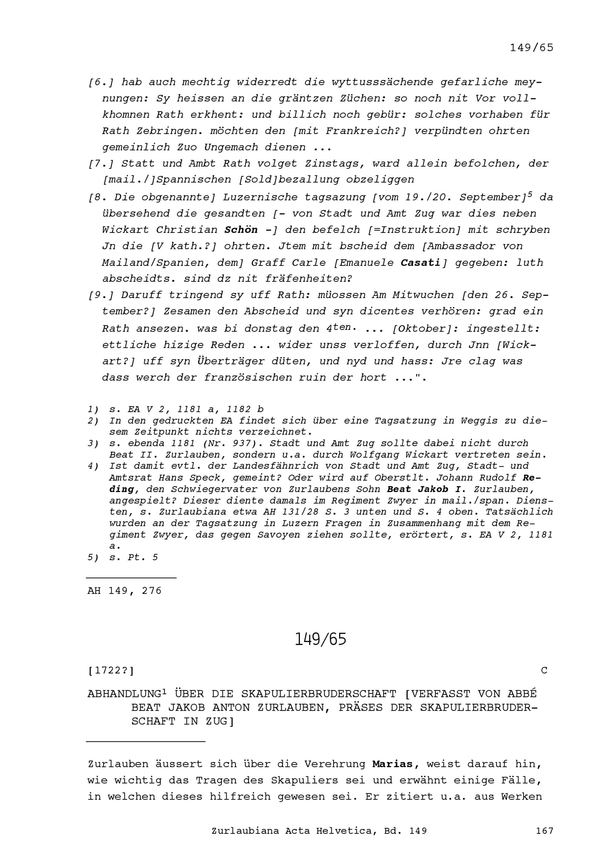 Notiz von Beat II. Zurlauben, Stabführer der Stadt Zug, unter anderem über Wolfgang...