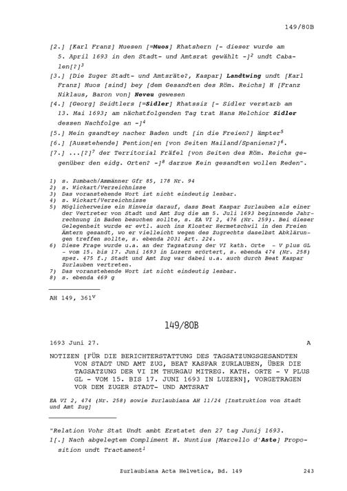 Notiz von Beat Kaspar Zurlauben, Statthalter von Stadt und Amt Zug
