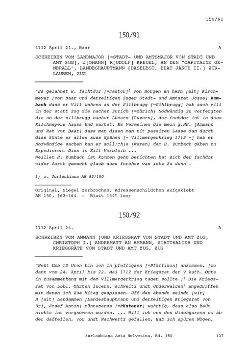 Schreiben von Christoph I. Andermatt, Ammann und Kriegsrat von Stadt und Amt Zug, an Ammann, Statthalter und Kriegsräte von Stadt und Amt Zug