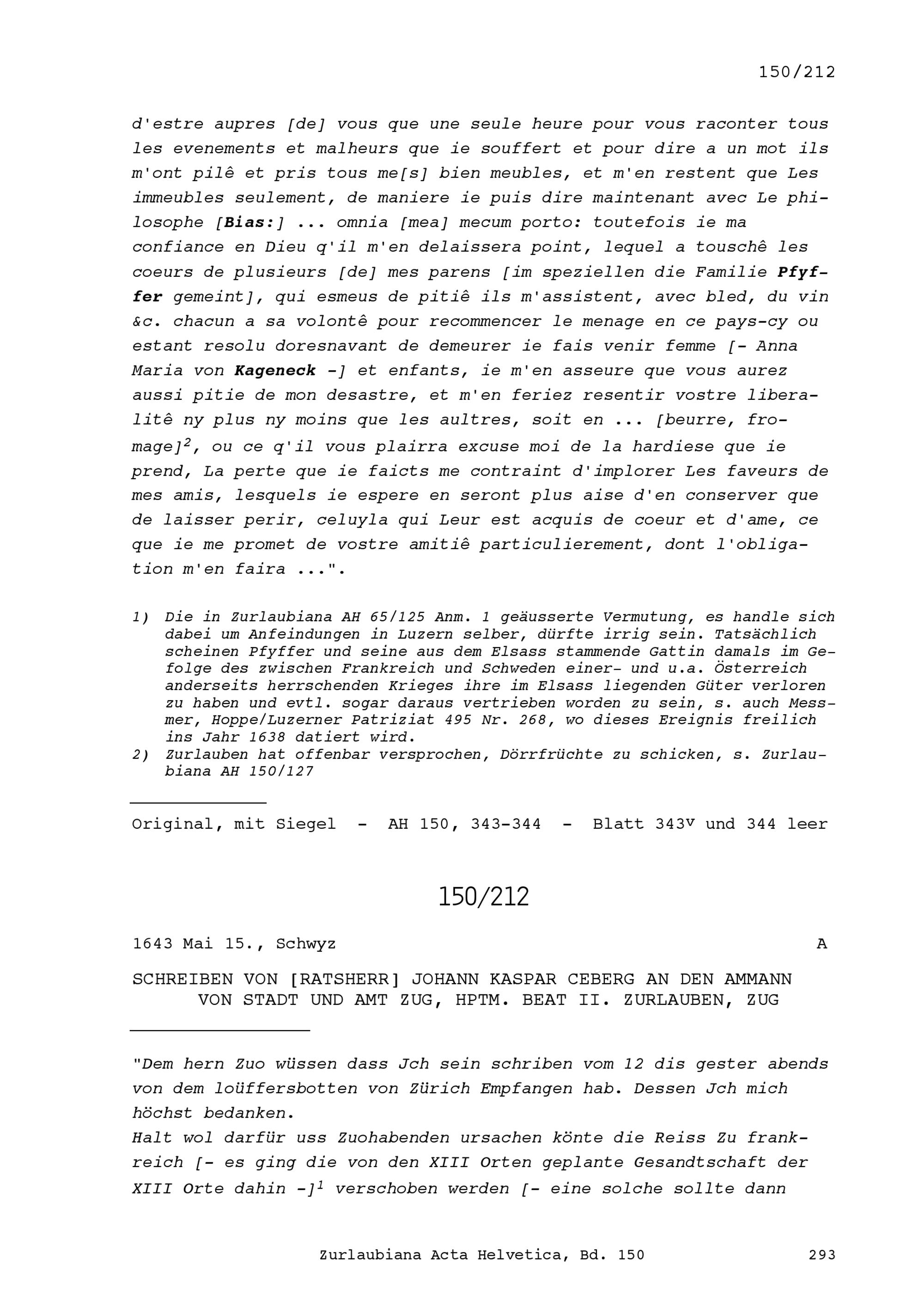 Schreiben von Rudolf Pfyffer, Arzt, an Beat II. Zurlauben, Altammann und Stadt- und Amtrat, Zug