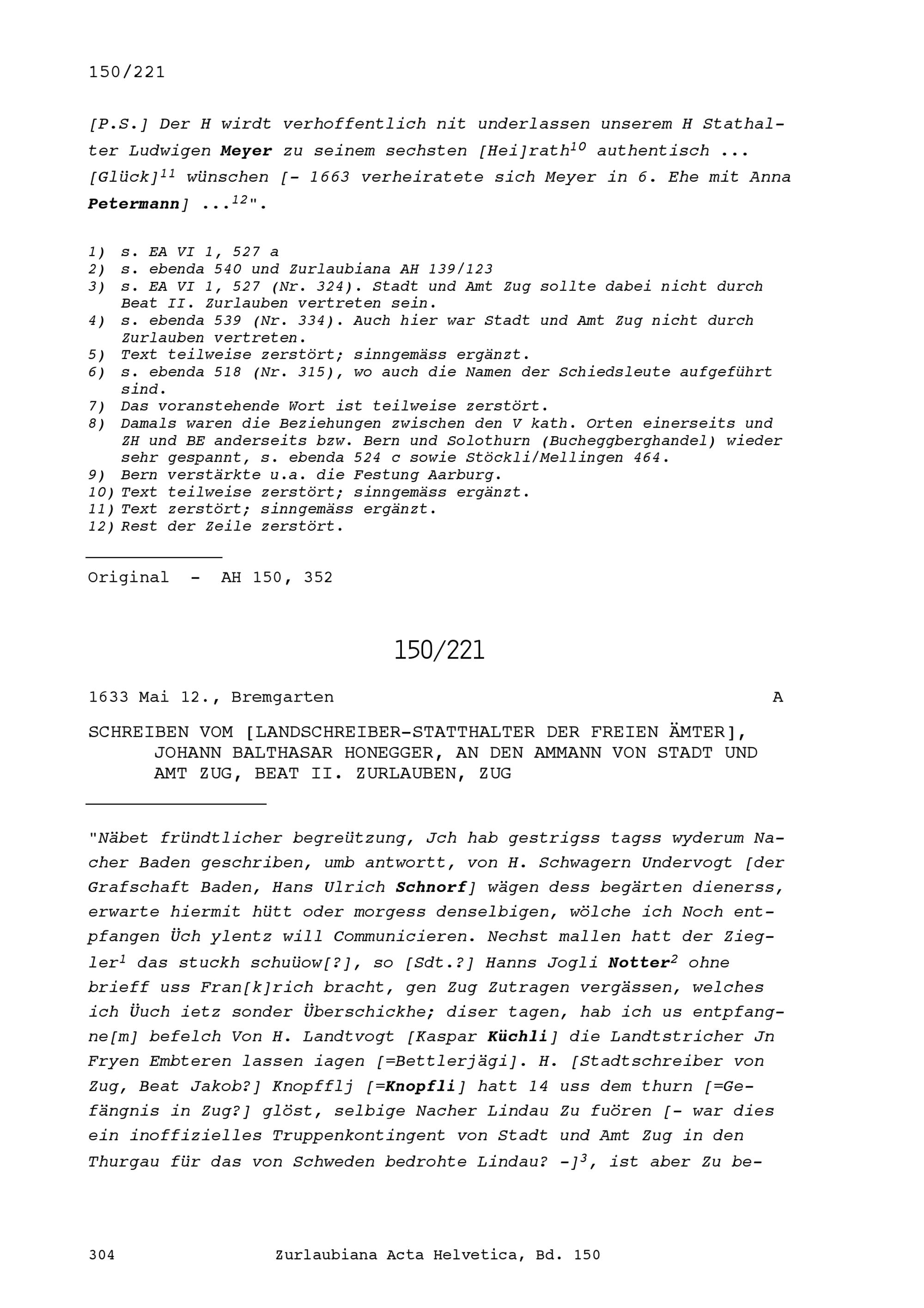 Schreiben von Ludwig Hartmann, Stadtschreiber, an Beat II. Zurlauben, Stadt- und Amtrat Zug