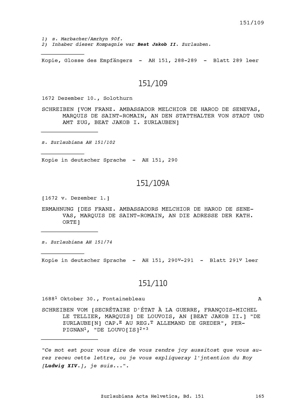 Schreiben von François-Michel Le Tellier, Marquis de Louvois, Secrétaire d'état à la guerre, an Beat Jakob II. Zurlauben im Regiment Greder