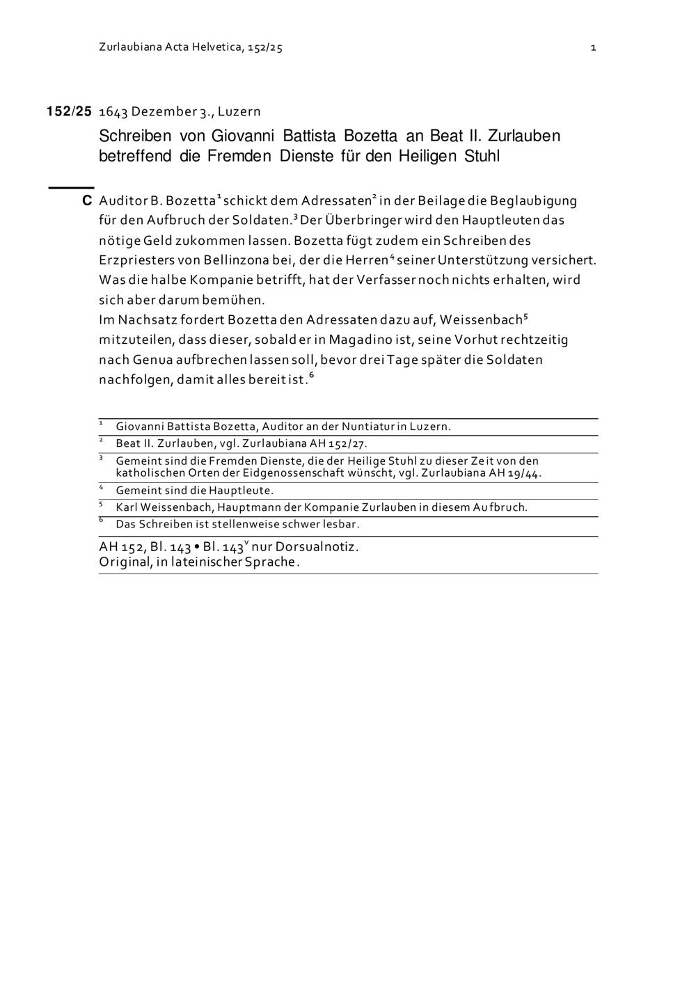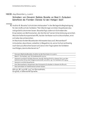 Schreiben von Giovanni Battista Bozetta an Beat II. Zurlauben betreffend die Fremden Dienste für den Heiligen Stuhl