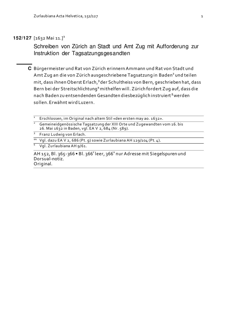 Schreiben von Zürich an Stadt und Amt Zug mit Aufforderung zur Instruktion der T...