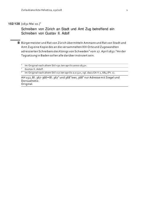 Schreiben von Zürich an Stadt und Amt Zug betreffend ein Schreiben von Gustav II. Adolf